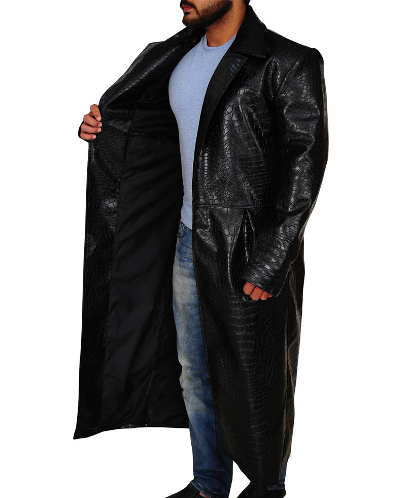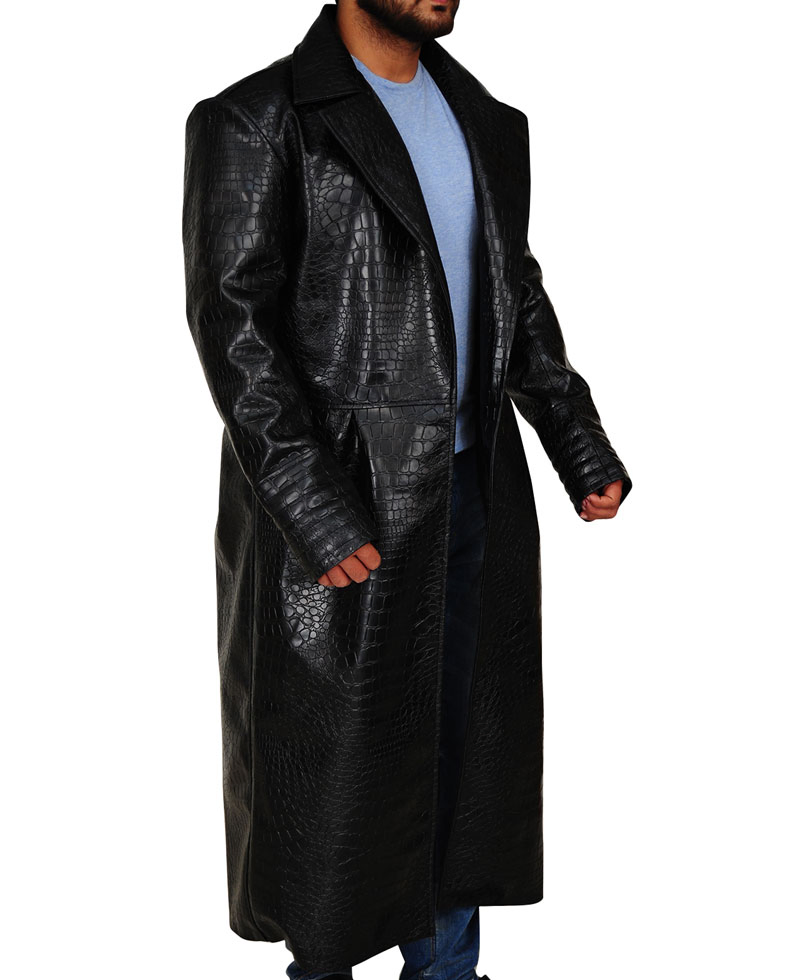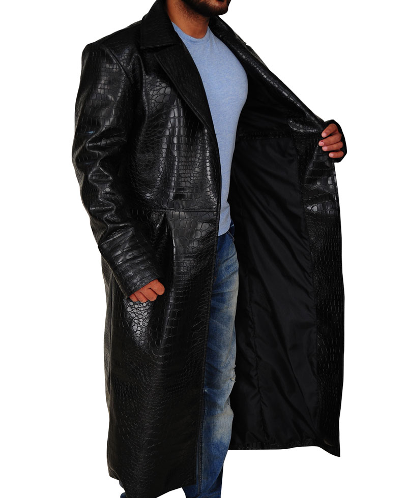 While portraying the character of Morpheus, the American talented actor Laurence Fishburne wore this leather coat in the hit movie called the Matrix. This trench coat is manufactured with a high and rich quality of faux leather material. It has an internal lining of soft and comfortable viscose that keeps you warm and cozy. The coat appears in the black color. The Matrix Morpheus coat has an open style frontal. This leather trench coat has two front side waist pockets along with two inside pockets where you can keep stuff. The Matrix Laurance Fishburne alligator coat has open hem style cuffs on full length style fitted sleeves. The lapel collar fits perfectly for this leather trench coat. This coat is the exact replica of the original one.