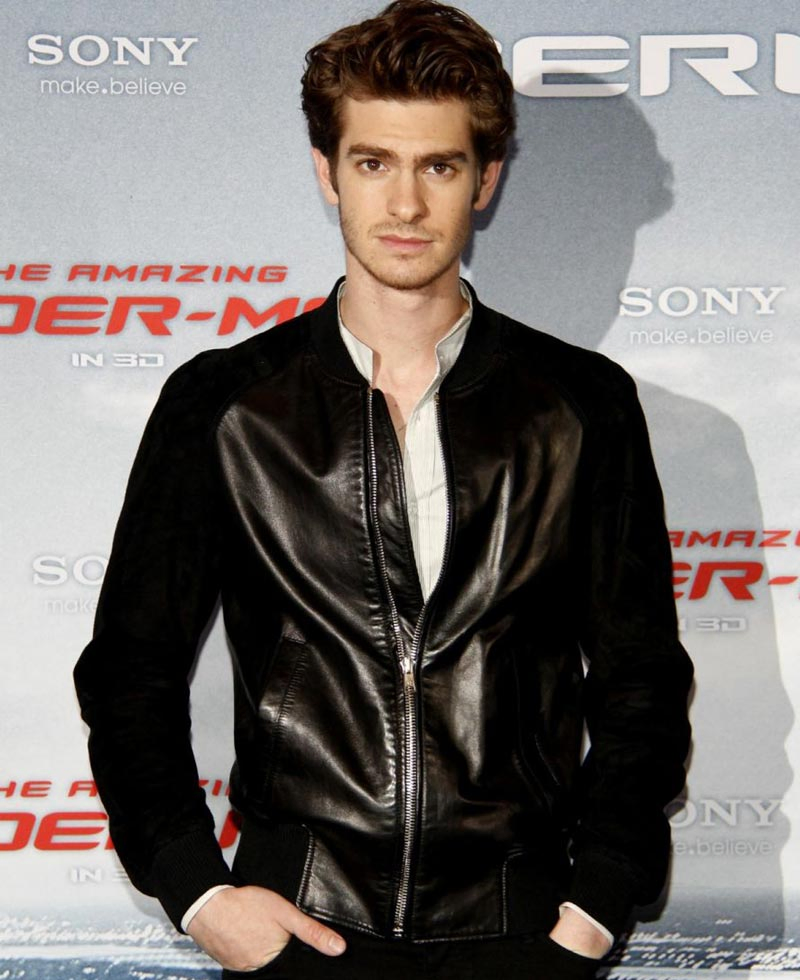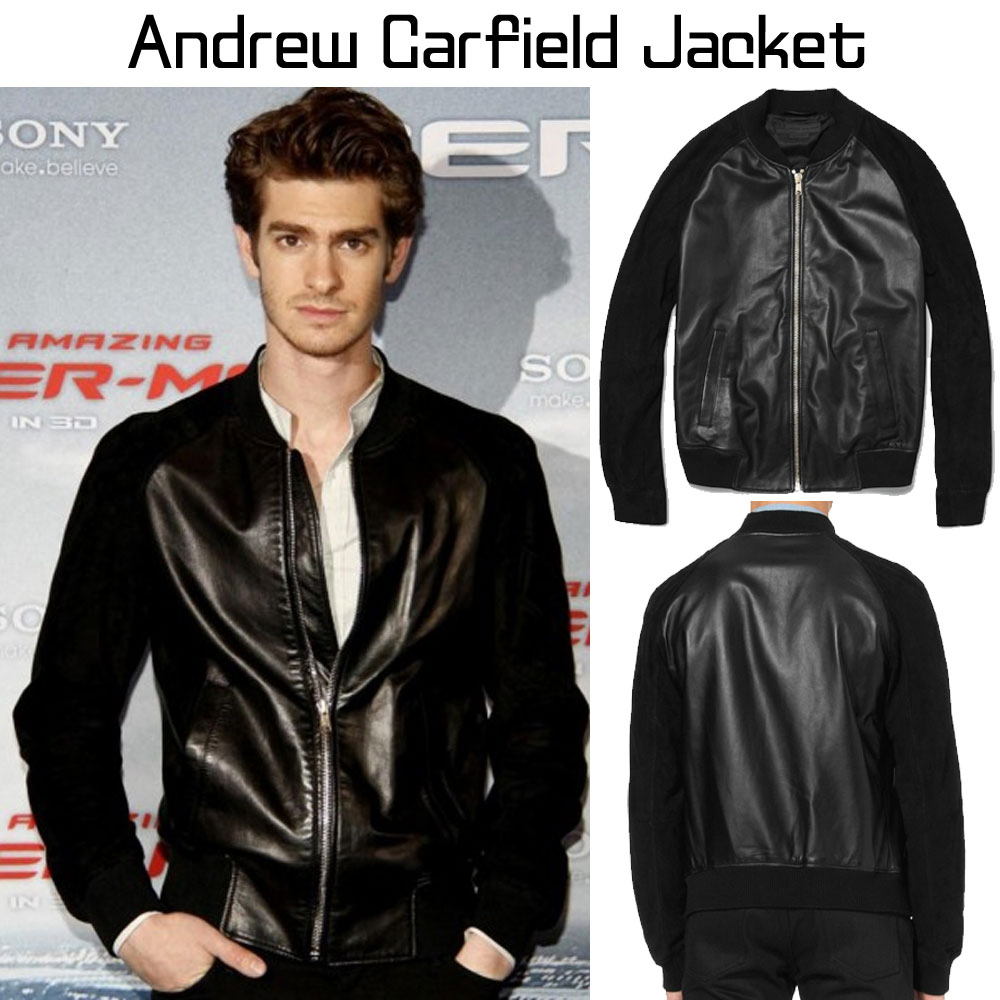 Andrew Garfield is an American actor who rose to fame due to his acting skills in Spiderman franchise. He has maintained a casual style for himself and his cool persona shines through his clothing choices. On and event he was seen wearing Andrew Garfield black leather jacket which became a statement piece and caught the attention of many. The Andrew Garfield leather jacket is prepared from genuine leather to attain a similar style and the high point of the jacket is the use of suede fabric on the complete sleeves. The Andrew Garfield black jacket has a mundane looking front zipper closure and a rib knit collar to bring calmness and casualness to the jacket. Vertical zipper pockets are present on both sides of the waist of the Andrew Garfield black leather jacket and to tie off the look rib knit material is also used on the cuffs of the full sleeves on the sides of the hemline.