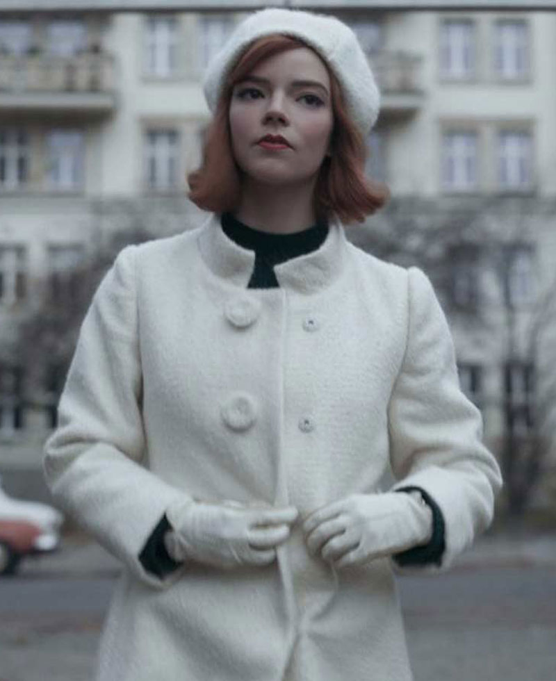 The idea of this coat is taken from the famous American phycological mini web television drama series called The queen’s Gambit where the gorgeous actress Anya Taylor Joy wore this stylish coat when she was portraying the character of Beth Harmon. Top-quality wool material is used in the fabrication of this coat. On the internal side of Beth Harmon coat is a lining of smooth and soft viscose that keeps you warm and comfortable all the time. The coat comes in white color. Beth Harmon coat has buttons on its front side for closure. The coat has a stand-up style collar. The Queen’s Gambit Anya Taylor Joy white coat has two internal pockets where you can secure stuff. The coat also has open hem style cuffs on long length style sleeves. It is perfect for parties. It will give you a nice and elegant appearance.