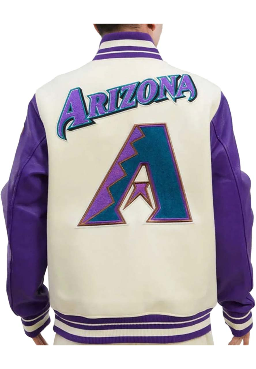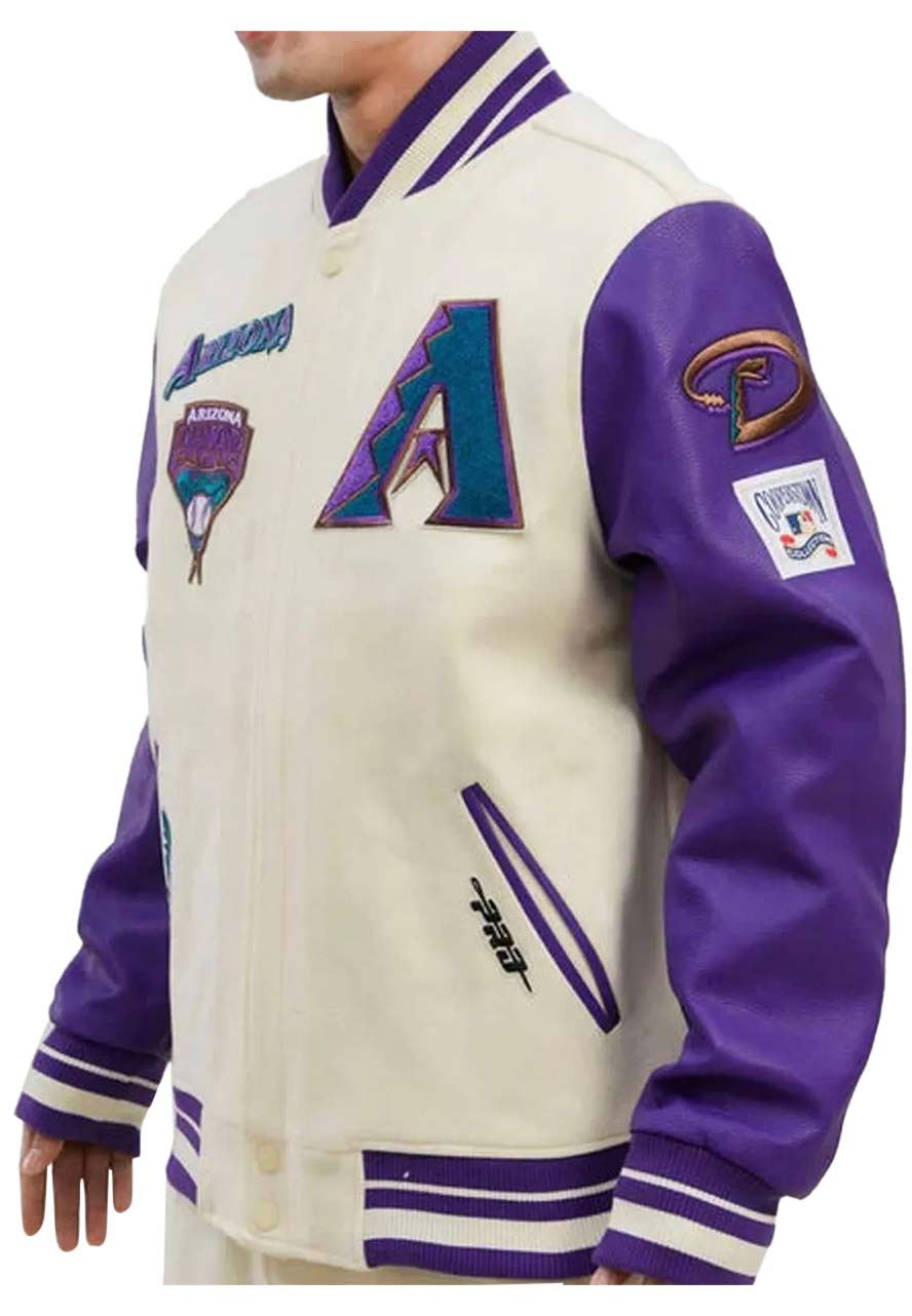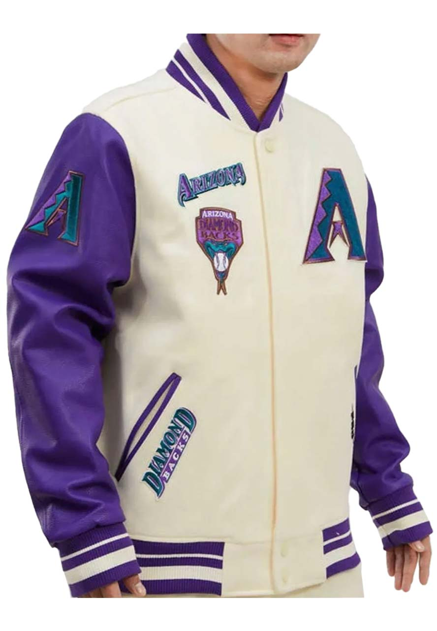 The Perfectly Fitted Arizona Diamondbacks Varsity Jacket Will Boost Your Outerwear Game by Combining Traditional Style With Modern Flair. The Dapper Jacket Has Been Fabricated by Premium-quality Wool to Make It Warm and Ageless, While Its Soft Viscose Inner Will Comfy You All-day Long. The Combination of Purple and White Colors Will Look Stunning on You. The Rizona Diamondbacks Jacket Has Been Designed by Using All Remarkable Features Like a Rib-knitted Stand-up Collar, Snap Tab Buttoned Closure, Rib-knitted Cuffs and Hemline, and Side Waist Pockets Are Good to Keep Your Small Accessories. The Arizona Varsity Jacket Will Get You Step Out With Confidence and Enchanted Style.