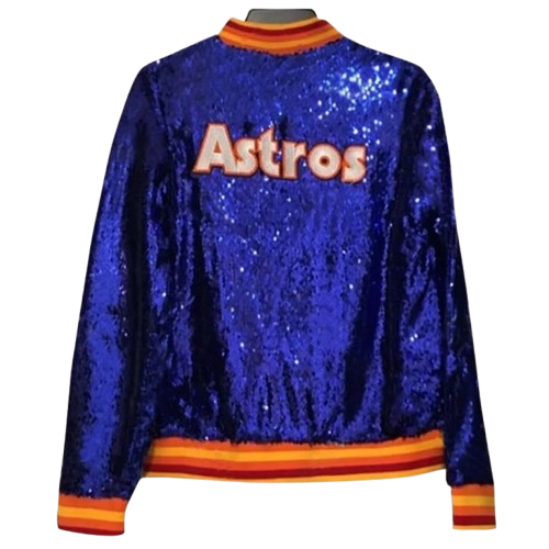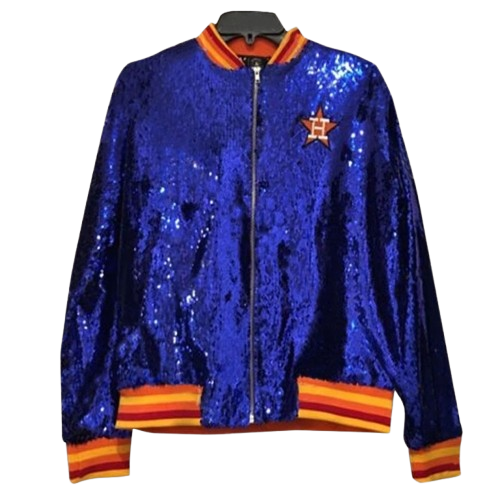 The Astros blue sequin jacket shines in a vibrant blue color, featuring a bold orange star on the front and the word “Astros” on the back, symbolizing your support in true fashion-forward style.