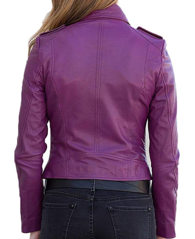 Donning stylish outfit can easily lift up the confidence of any person and make them look apart from everyone else. Women’s purple motorcycle jacket, plays its part in beautifying the appearance of a woman and also make them look their edgiest. Purple leather jacket women’s is made in both genuine leather and faux leather to fit the needs of the consumers and to make the person stand out more. Women’s purple motorcycle jacket has a lapel zipper closure along with studs on the corners. Zipper cuffs are present on full length sleeves and viscose fabric is used to line the purple leather jacket women’s helping the person to exude class. The color of luxury and royalty of purple leather jacket women’s when mixed with intricately designed zipper pockets on both sides and snap tab loops on shoulder helps to lock in the fashionable and sharp look which looks perfect for any event