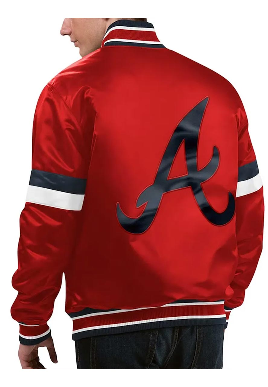 Now experience your day-to-day task or any adventure with confidence while owning a charismatic personality, just required to shop and wear the Atlanta Braves red home game varsity jacket. This dapper jacket has been fabricated by premium-quality satin to make it lightweight and wearable in all seasons, while its soft viscose inner will comfy you all day long. The shiny red color will enhance your smartness. The Atlanta Braves varsity satin jacket has been designed by using all smart features like a rib-knitted stand-up collar, snap tab buttoned closure, rib-knitted cuffs, and hemline and side waist pockets to keep your small accessories. The Atlanta Braves varsity jacket will add a touch of glamour to your overall look.