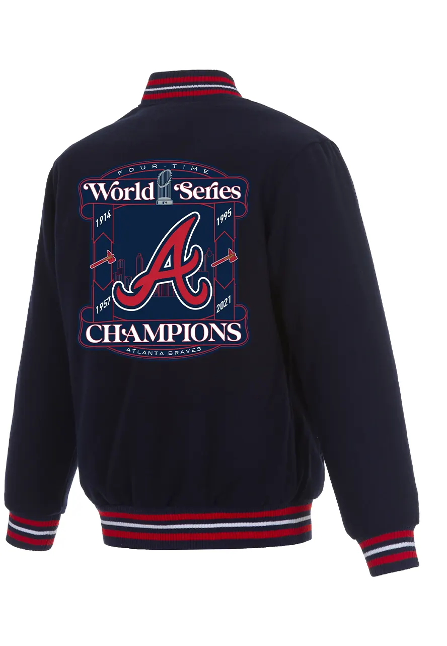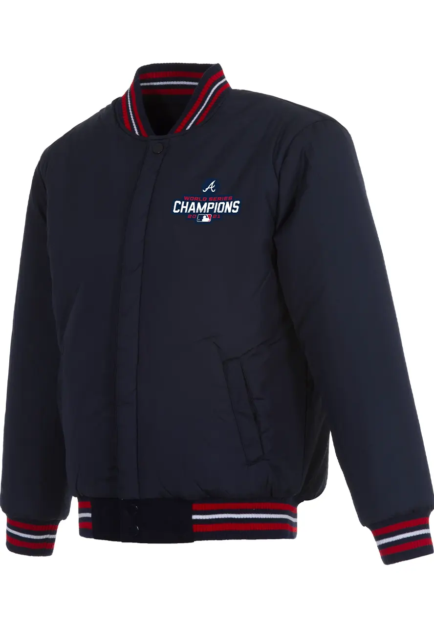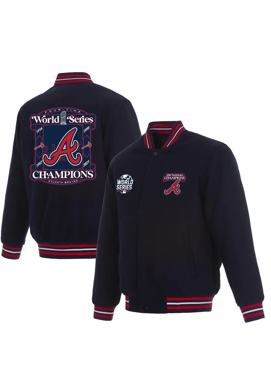 Wearing This Durable Yet Elegant Atlanta Braves World Series Jacket, You Can Win the Hearts of All Around You Through Your New Style. This Jacket Has Been Made for Standing Up to Any Weather, and It Will Unleash Your Inner Adventurer. The Exquisite Jacket Has Been Fabricated by Premium-quality Wool to Make It Warm and Ageless, While Its Soft Viscose Inner Makes It Comfortable and Moisture-Free. The Strong Blue Color Will Enhance Your Smartness. The Atlanta Varsity Jacket Has Been Designed by Using Remarkable Features Like a Rib-knitted Stand-up Collar, Snap Tab Buttoned Closure, Rib-knitted Cuffs and Hemline, and Side Waist Pockets to Keep Your Small Accessories. The Atlanta Varsity Jacket Offers the Perfect Blend of Warmth and Fashion-forward Design.