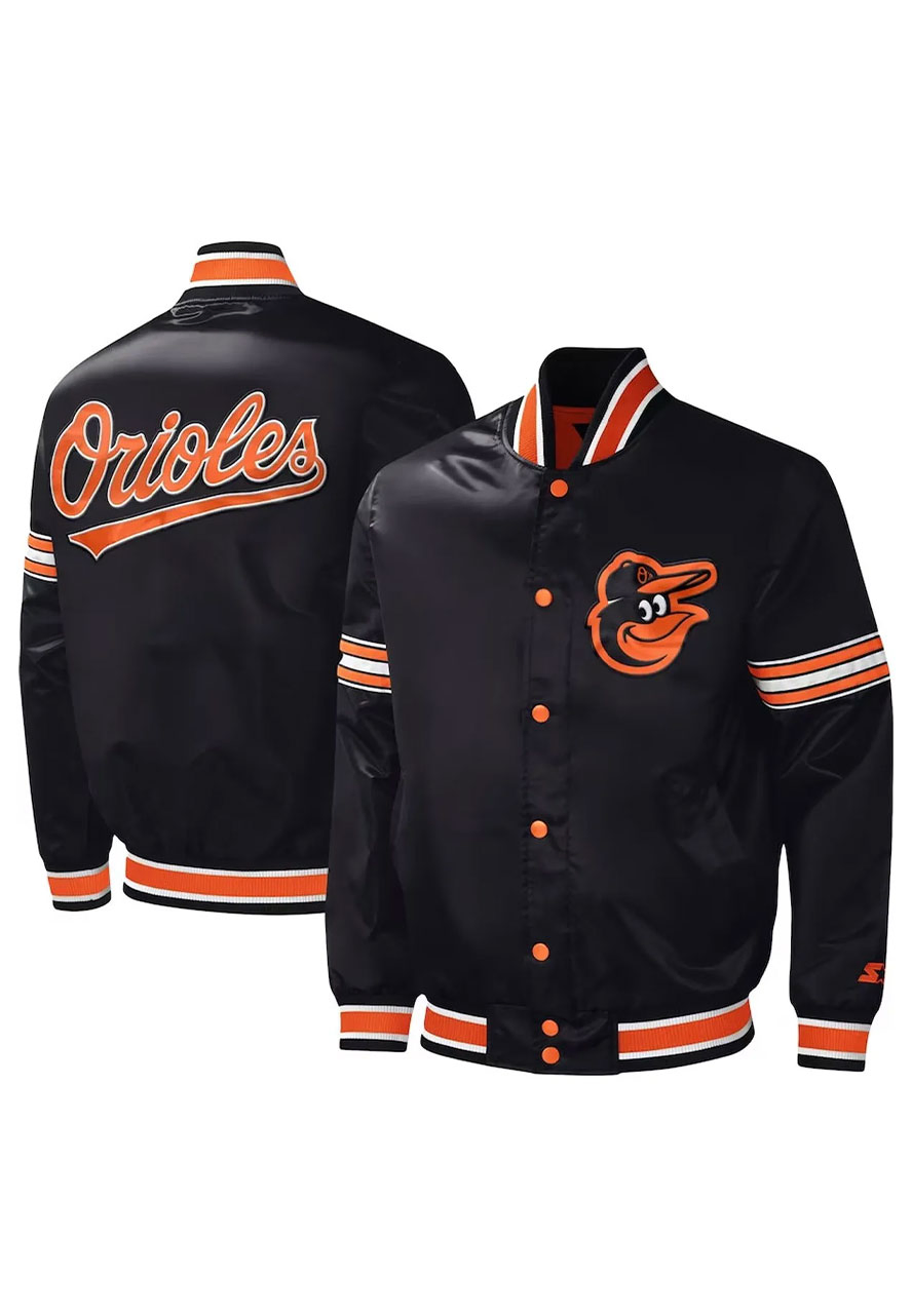Looking for the layering with a perfect blend of athleticism and style? If so, then you must shop and wear the Baltimore Orioles midfield black varsity jacket, it will also accentuate your handsome physique. The premium-quality satin fabrication makes it lightweight and wearable in all seasons, while its soft viscose inner will comfort you as long as you wear it. The shiny black color will go over any outfit. The Baltimore Orioles midfield varsity jacket has been designed by using features like a rib-knitted stand-up collar, snap tab buttoned closure, and two side waist and inner pockets to keep your small accessories. The Baltimore Orioles varsity jacket will enrich your personality with charm and elegance.