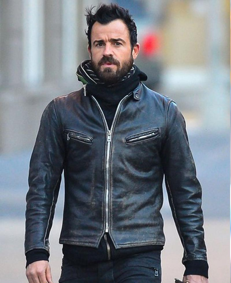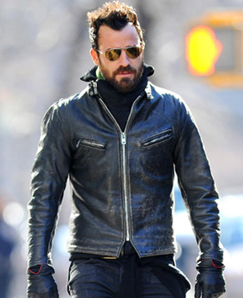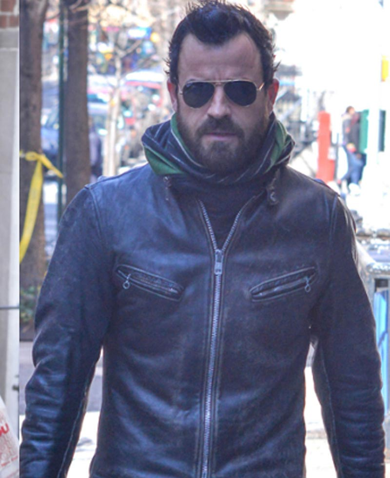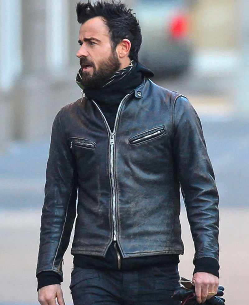 Prepared from top-grade genuine leather Justin Theroux Leather Jacket is enough to make you win in a gathering. The designing of the attire has done especially for bikers. Black color is the eternal charm which you enjoy. Internally you will found comfortable rayon lining. Front shutting is given with the best quality zip. The flapped button collar style of the Justin Theroux Biker Jacket is fabulous. Two zipper pockets are given on the chest. A slim-fitting appearance forms your smarter look. Wear it during bike riding as well as in every important event. Sleeves are long in measurement and have apt look. Justin Theroux Leather Jacket.