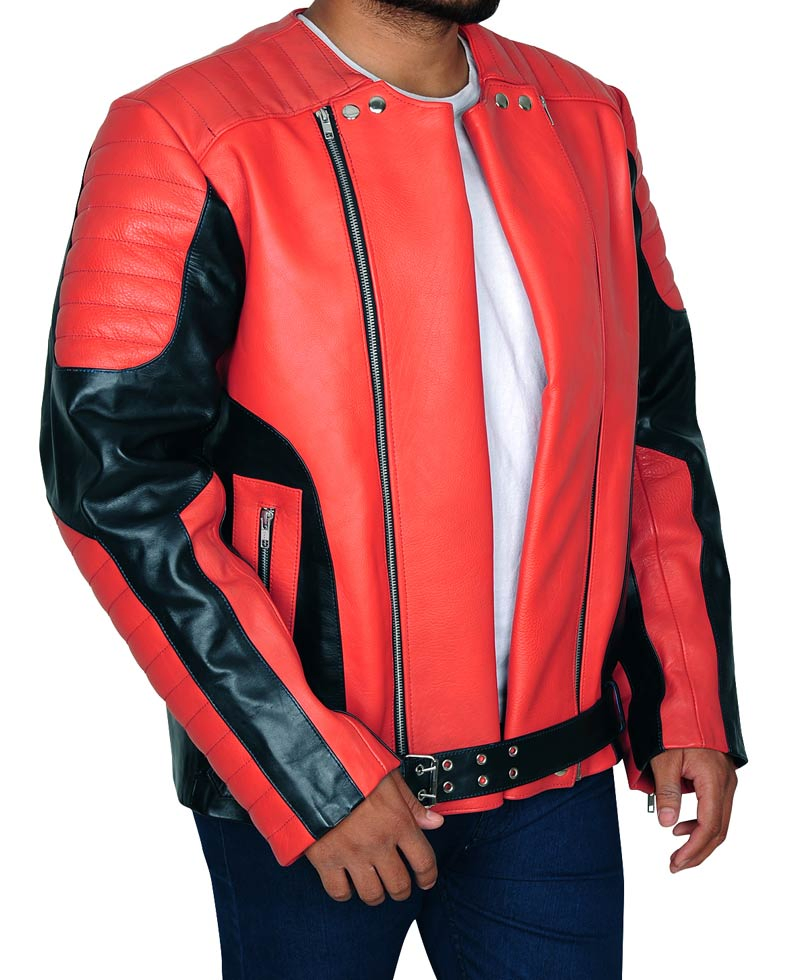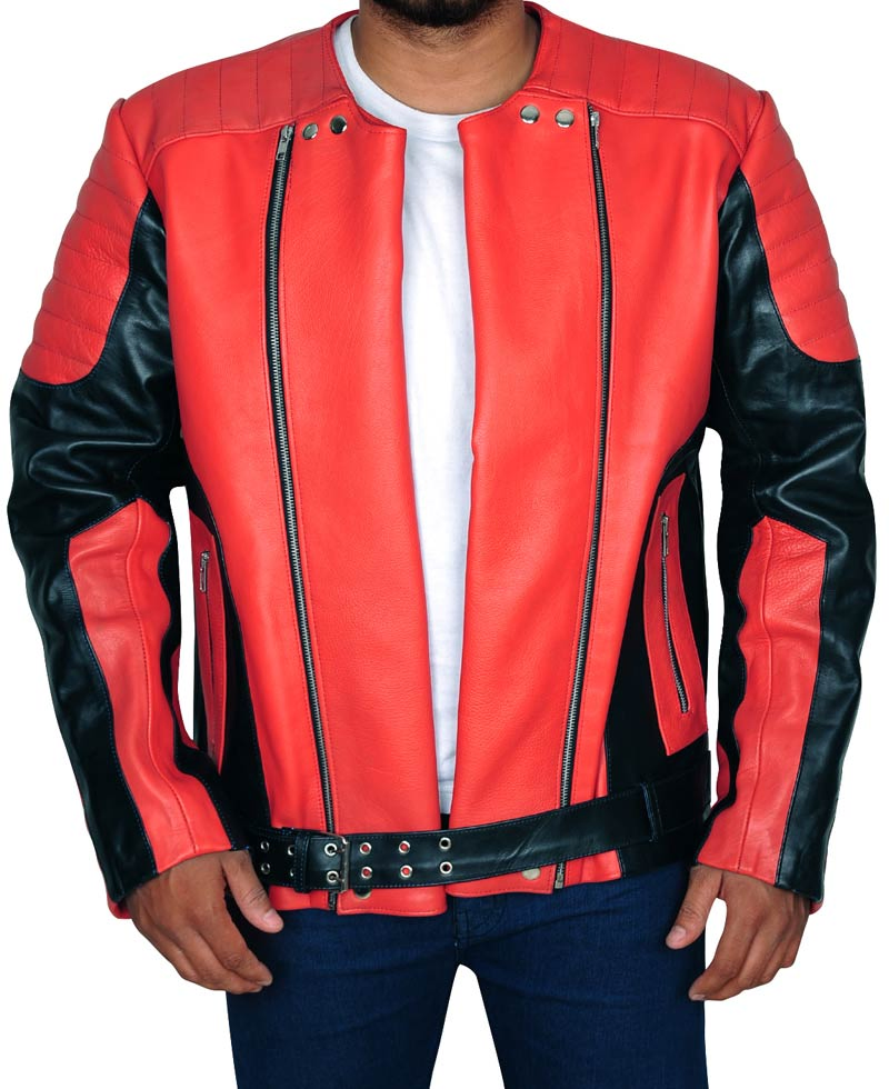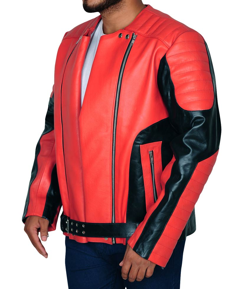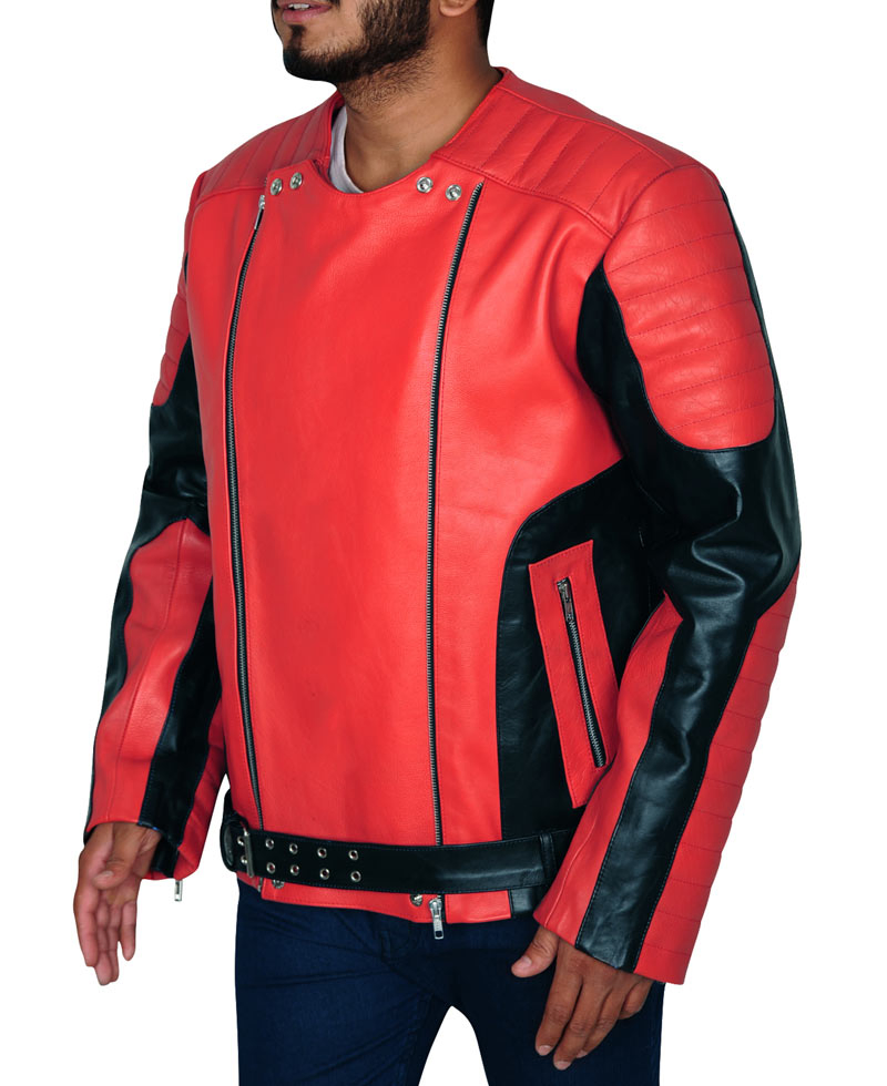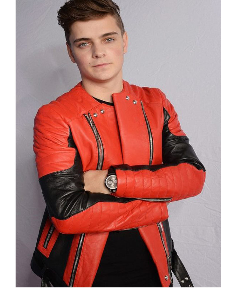 Martin Garrix Jacket is made up of genuine leather or faux leather which is suitable. The collar style is round neck collar which is looking brilliant. The frontier part of the attire is attached with YKK original branded zipper closure. Long sleeves have zipper cuffs. Adjustable waist belt is also present. Martin Garrix Leather Jacket has two side waist zipper pockets and two pockets inside the jacket. The jacket is colored with awesome and sweet red and blackish shade, these two colors mash up gained the remarks of the apparel. The shoulders, sleeves and arms have padded designs.
