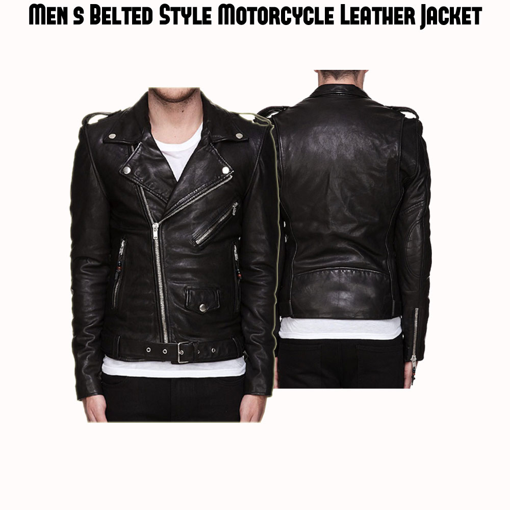 Men’s Belted Style Asymmetrical Zipper Black Leather Biker Jacket