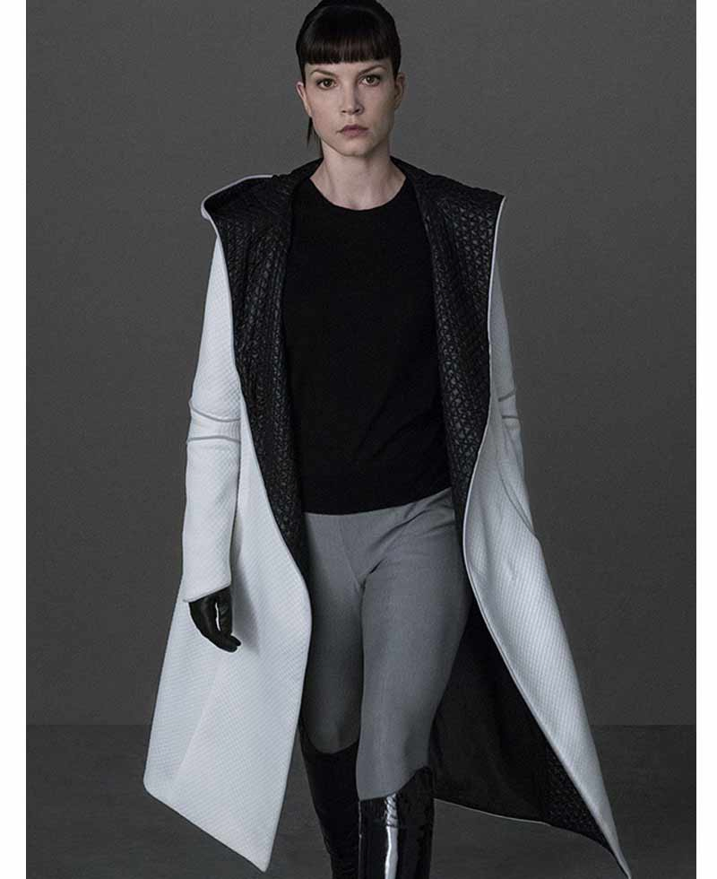 Blade runner luv white coat was worn by Silvia hoeks in the mystery movie Blade Runner 2049. She looked dazzling in this Luv White Coat. It is fabricated from cotton material and holds internal soft viscose lining. The white color is definitely made for this attire as it gives it an edgy and charming look. Blade runner 2049 Luv coat comes with front open style. It has one side pocket that gives the coat an appealing look. Full-length sleeves come with open hem cuffs. This blade runner coat is the perfect pick this winter to have a classy and engaging look. It has a very engaging hooded style collar.