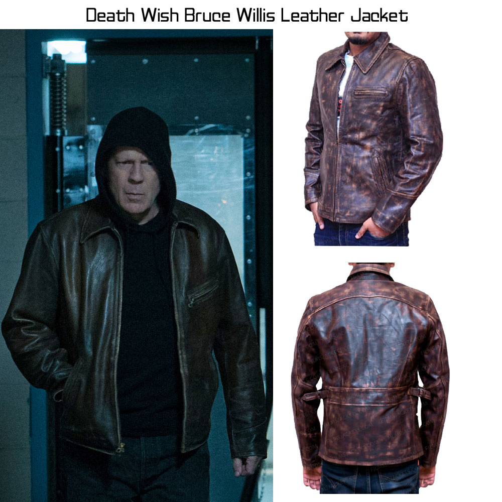 Best genuine leather is used in the making of Death Wish Bruce Willis Jacket. High quality zip is given for the front opening. Two side waist pockets are present in the gear. You will found viscose inner lining. Distressed brown color of the Paul Kersey Jacket is sophisticated. You look very charming. One welt zipper pocket is given on left chest. Long sleeves are given with button cuffs. The shirt collar style is unique and stunning. Buy Bruce Willis Death Wish Leather Jacket and won the hearts of people around you.