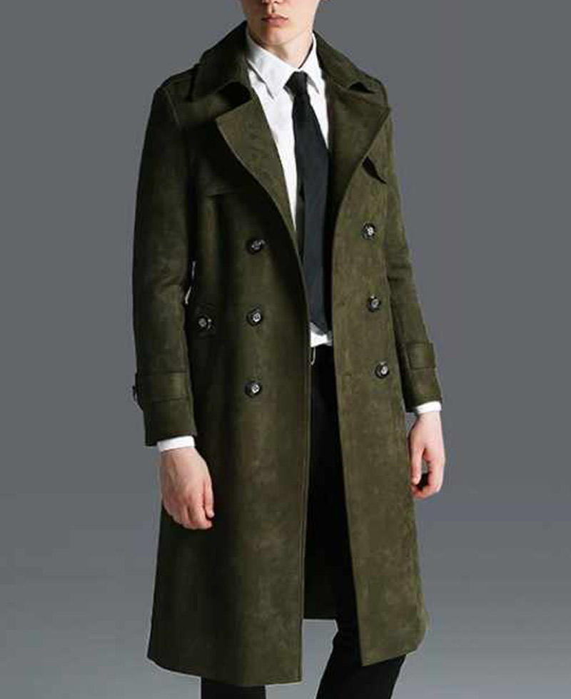 Men’s Military Green Double Breasted Suede Leather Coat