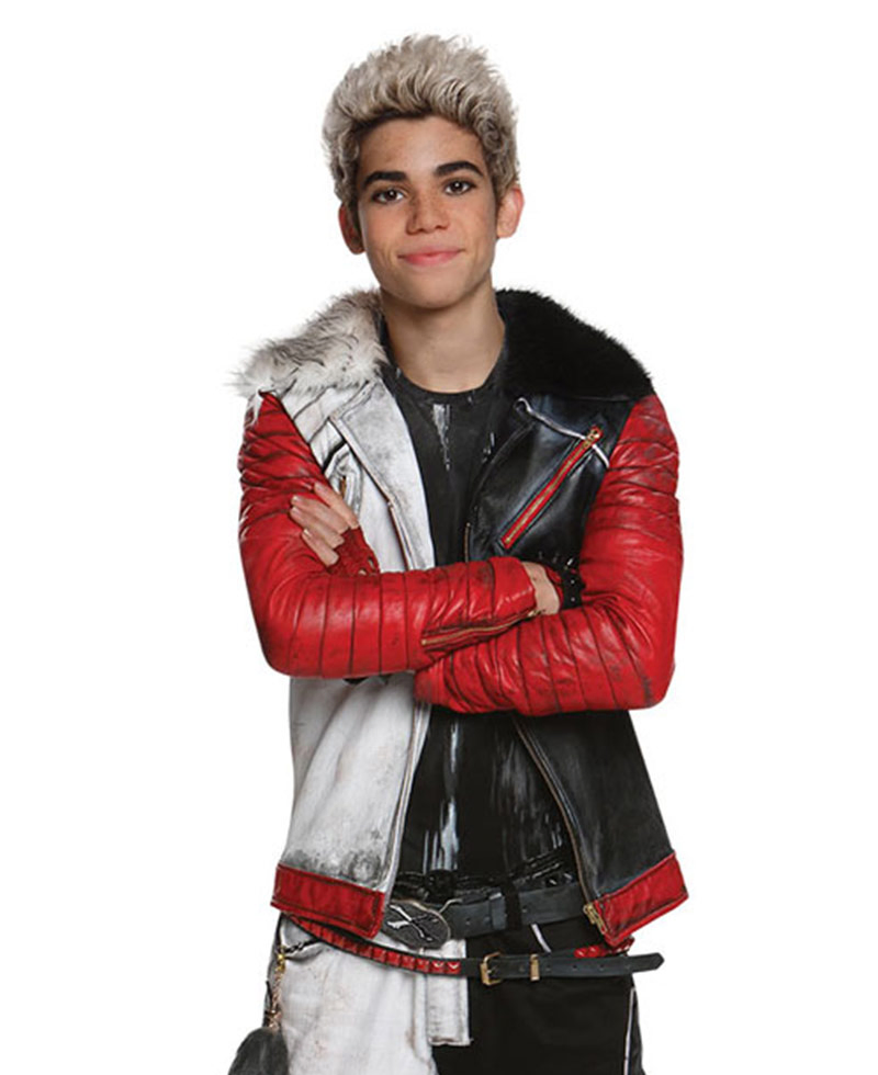 The outer cover of Carlos Descendants Jacket is prepared from top grade genuine leather. In 2015, American musical movie named as “Descendants” got extraordinary fame because of impressive appearance of Cameron Boyce. He portrayed the role of Carlos in the same movie beautifully. He wore spellbinding Cameron Boyce Jacket and looked stylish. Comfy rayon inner lining is present in it. The amazing mishmash of red, white and black shade has formed charismatic appearance. Large lapel collar with shearling inner is the special feature of the attire. Two zipper pockets are given in vertical shape. At the back of Carlos Descendants Leather Jacket you will found “X”.  Front shutting is concerned with high quality zip. Both sleeves are large and have open hem cuffs.