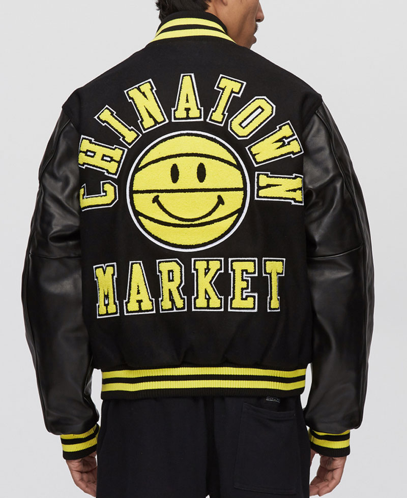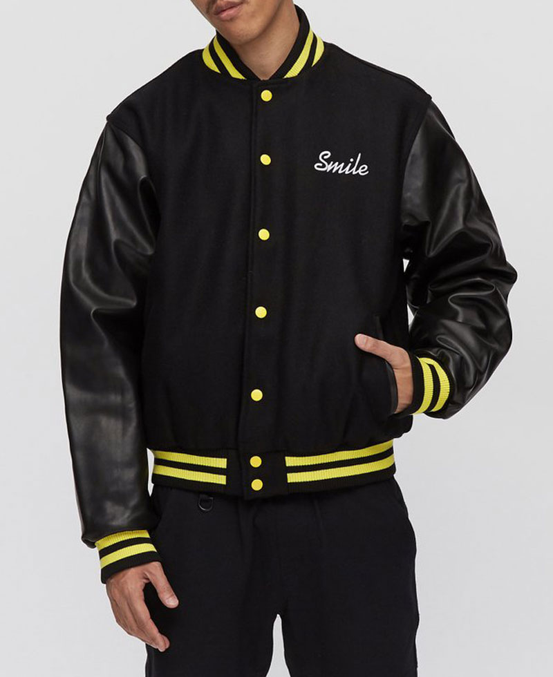 The classy leather jacket comes in black color. The Chinatown market varsity jacket is manufactured with premium and rich quality wool material along with top quality cowhide leather material. The internal side of this varsity jacket is fabricated with a smooth and soft viscose lining that keeps you warm and comfortable all the time. Chinatown market varsity jacket has buttons attached to its front side for the closure. The Smile written on the chest looks cute. There is a Chinatown market logo along with a smiley face on the back of this stylish varsity jacket. Chinatown market jacket has a rib-knitted collar. The leather full length sleeves come with rib knitted cuffs. Also, the jacket has a rib-knitted hemline that gives the apparel a fitted look. This varsity jacket has two front waist pockets where you can secure stuff.