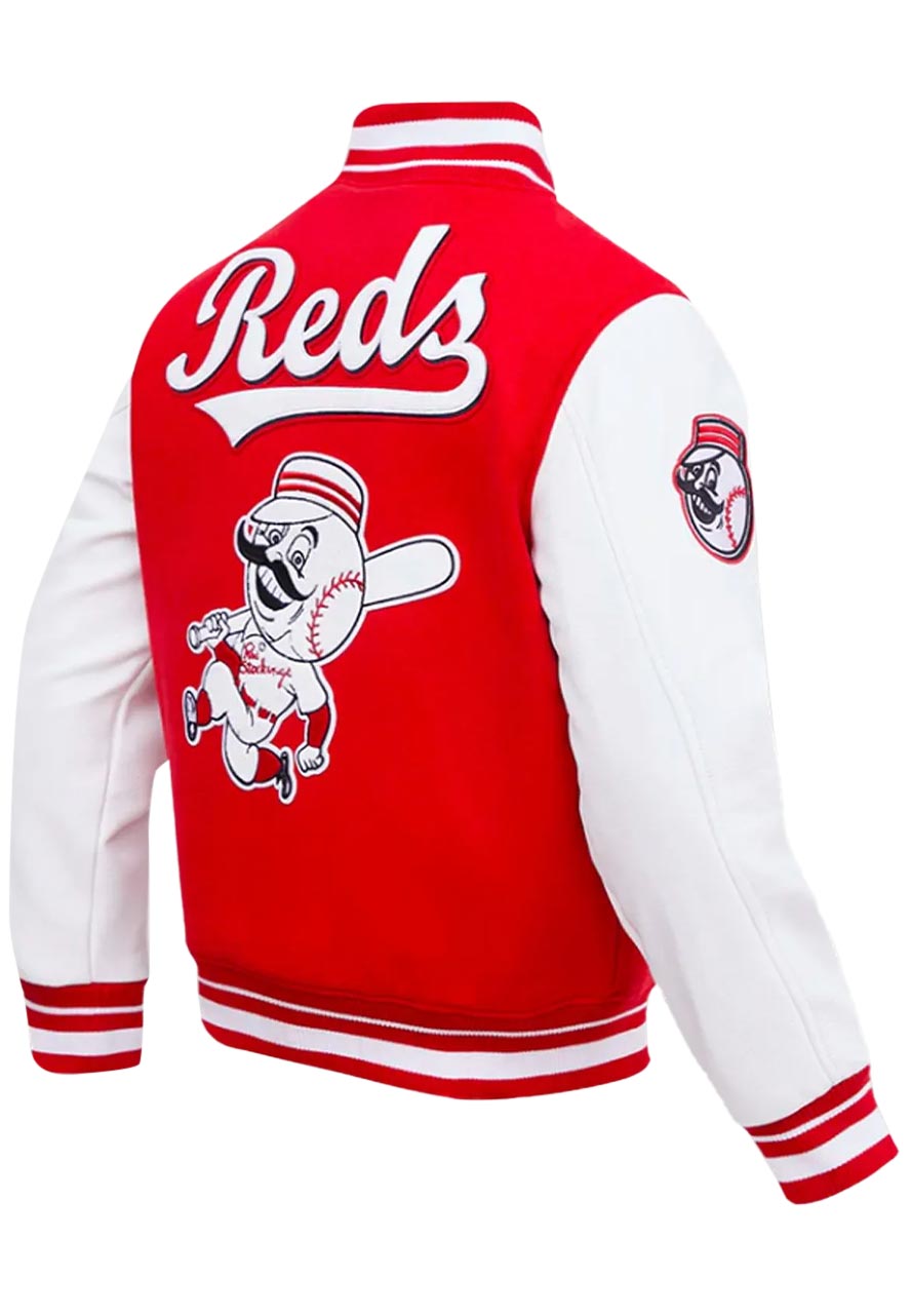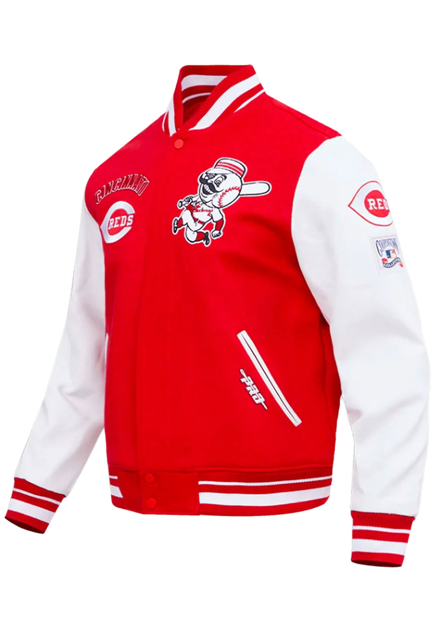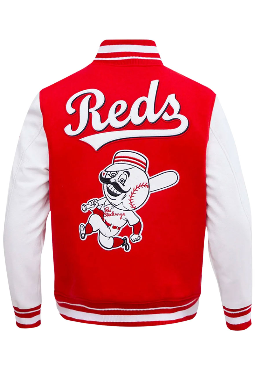 You Can Step Out With Elegance and Confidence While Wearing the Cincinnati Reds Retro Varsity Jacket. This is a Classic Essential for Any Wardrobe, and Perfectly Crafted for Any Outdoor Activity. The Dapper Jacket Has Been Fabricated by Premium-quality Wool to Make It Warm and Ageless, While Its Soft Viscose Inner Will Comfy You All Day Long. The Combination of Red and White Colors Will Look Stunning on You. The Cincinnati Reds Varsity Jacket Has Been Designed by Using Remarkable Features Like a Rib-knitted Stand-up Collar, Snap Tab Buttoned Closure, Rib-knitted Cuffs and Hemline, and Side Waist Pockets that Are Good to Keep Your Small Accessories. Now Stay Cozy and Fashionable With the Cincinnati Reds Jacket.