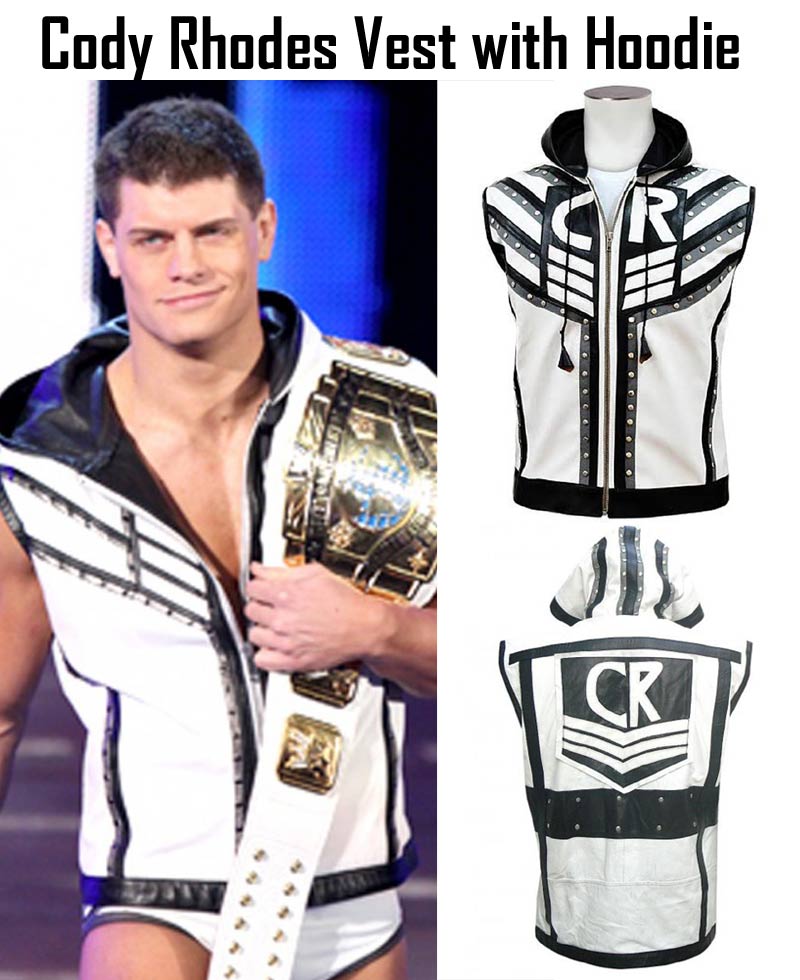 The superstars may be from any field like showbiz, sports, fashion industry, media, arts etc. The Cody Rhodes Vest is the inspiration taken from a WWE wrestler named as “Cody Rhodes”. He is a big name of wrestling and very famous for astounding dresses too. The outer part of the attire is made from top quality genuine leather. The soft viscose lining has increased the durable features. The super appealing Cody Rhodes Leather Jacket is available in black and white color. Match it with your outfit and look enchanting. The front zipper shutting provides you easiness that is liked by most of the people. It has hooded design that is really unique and charming. The beautiful metallic studs are present on the front, back, waist and hood. The Cody Rhodes Hoodie is a perfect selection for all casual occasions.