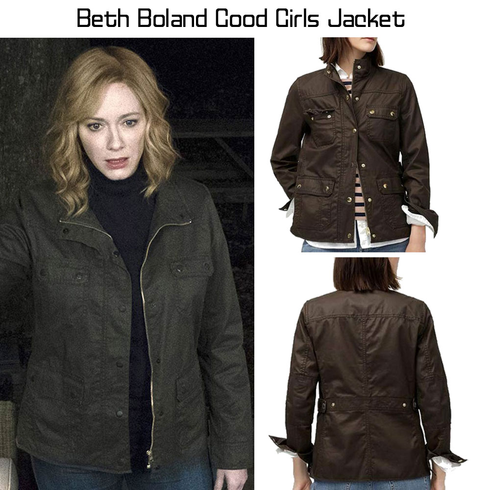 The wonderful and appealing simple brown jacket was worn by the gorgeous and talented American actress Christina Hendricks in the Popular American Comedy television drama series called Good Girls where she portrayed the character of Beth Boland. The external side of this Beth Boland Brown jacket is fabricated with top and rich quality of cotton material. It has an internal lining of smooth and soft viscose that keeps you warm and comfortable the entire time. The jacket comes with a snap tab style collar. The beth Boland brown jacket has full length style sleeves with snap tab buttoned style cuffs that make it classier to wear. Good girls Christina Hendrick brown jacket has two front side waist pockets and two chest flap pockets for securing stuff. This jacket comes with front ykk branded zipper closure with snap tab buttoned fastening. This jacket is the exact replica of the original one.