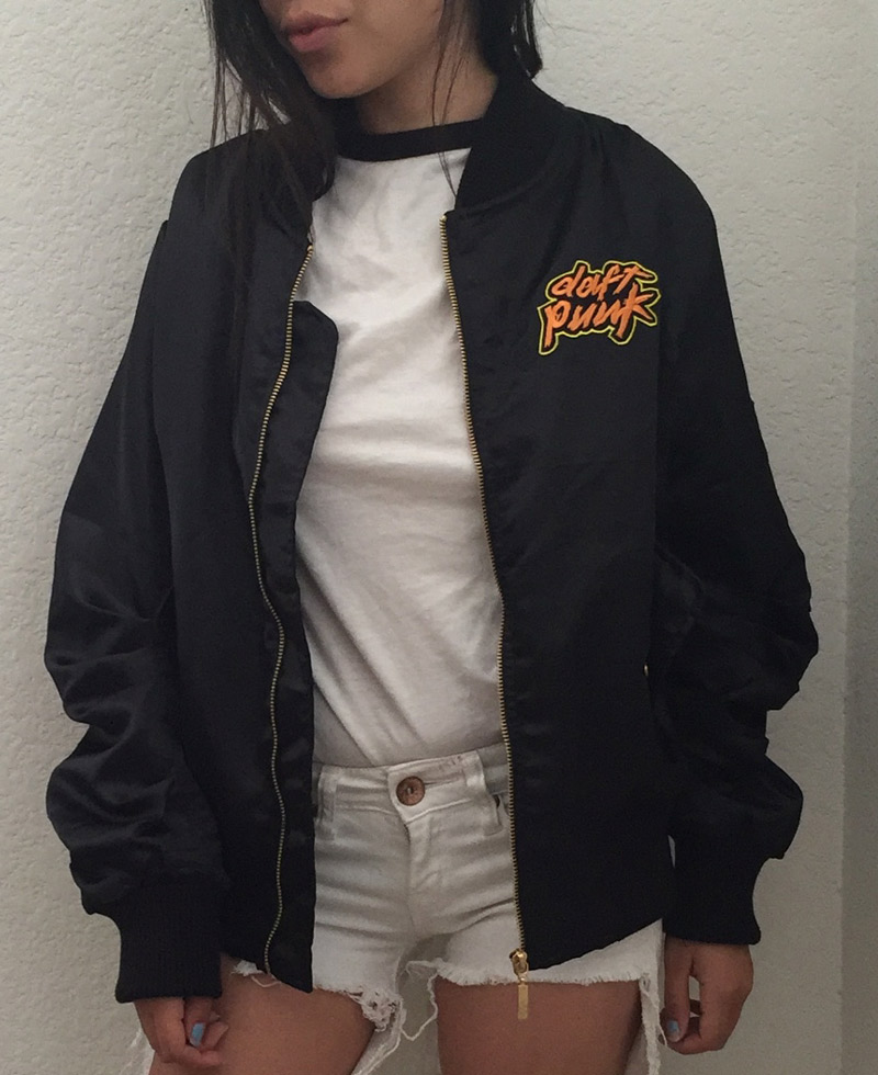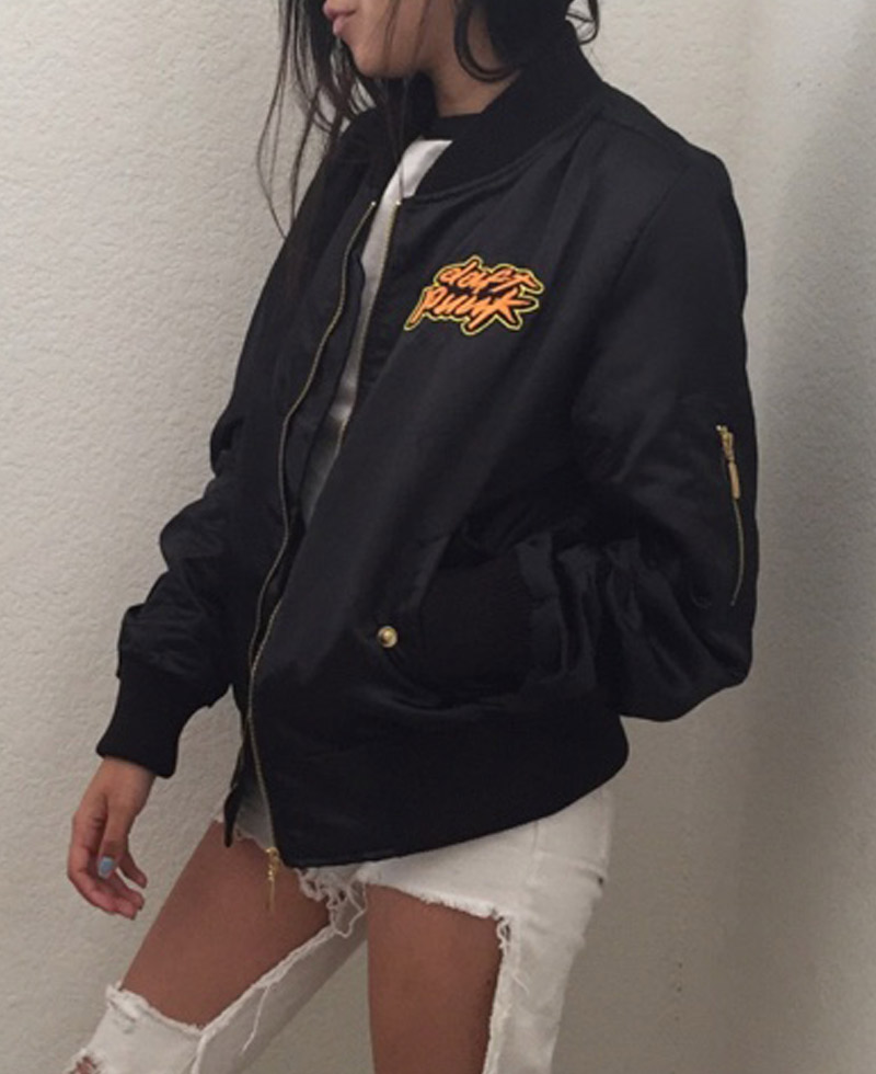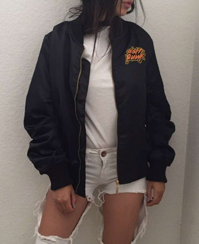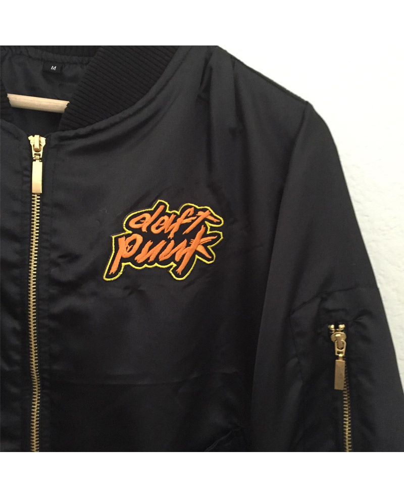 The stylish Daft Punk bomber jacket comes in an attractive black color. High and long-lasting quality satin fabric is used for the fabrication of this bomber-style classy jacket. There is an internal lining of smooth and soft viscose attached to the inner side of this bomber jacket that gives you warmth and comfort. The jacket is very light to wear. It has an erect style collar as well. The Daft Punk bomber jacket has a ykk branded zipper attached to its front side for the closure. The jacket has rib-knitted style cuffs on full-length style sleeves. Daft Punk Bomber jacket is Unisex. It has a rib-knitted hemline as well which gives the jacket a fitted look. The jacket has two front waist pockets where you can secure stuff.