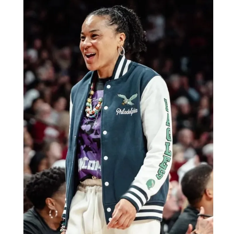 Show off your team pride in classic style with the Dawn Staley Eagles jacket. Designed for both men and women, this fleece letterman jacket perfectly blends comfort, durability, and team spirit. Made from high-quality fleece fabric, it delivers cozy warmth whether you’re cheering at the game or heading out for everyday wear. The navy and white color combination reflects the bold and timeless essence of the Eagles.