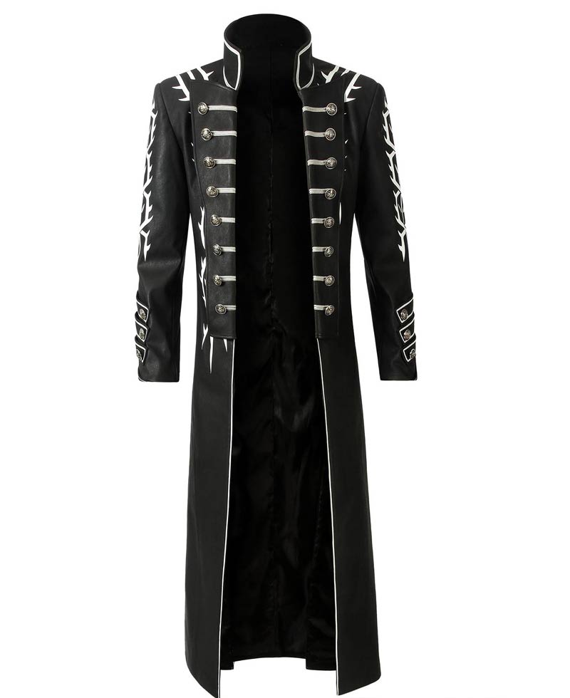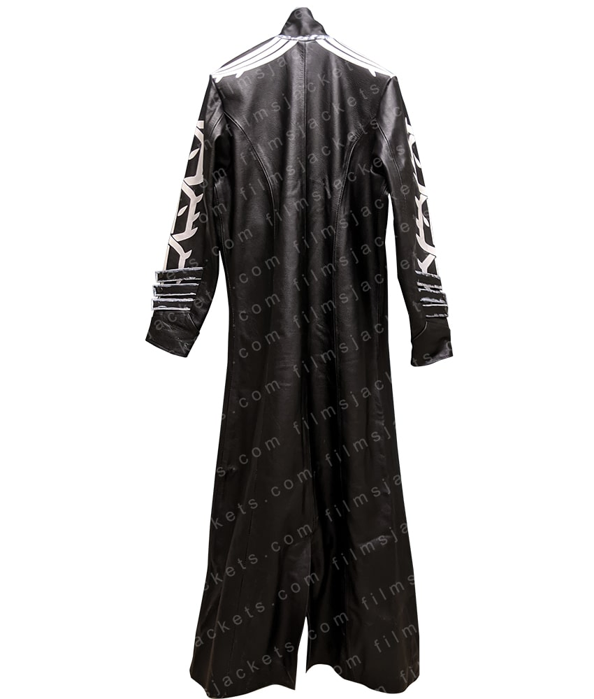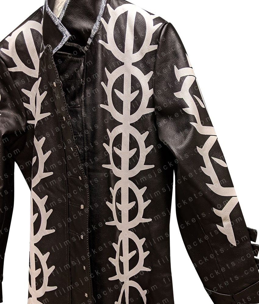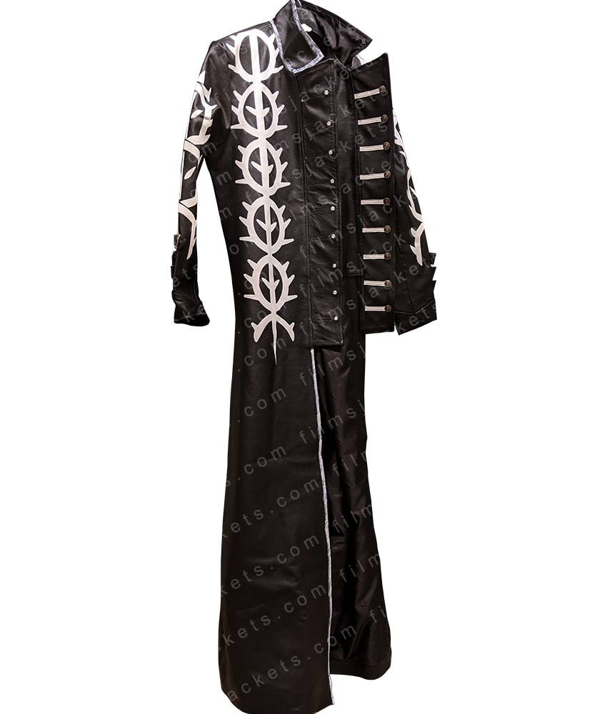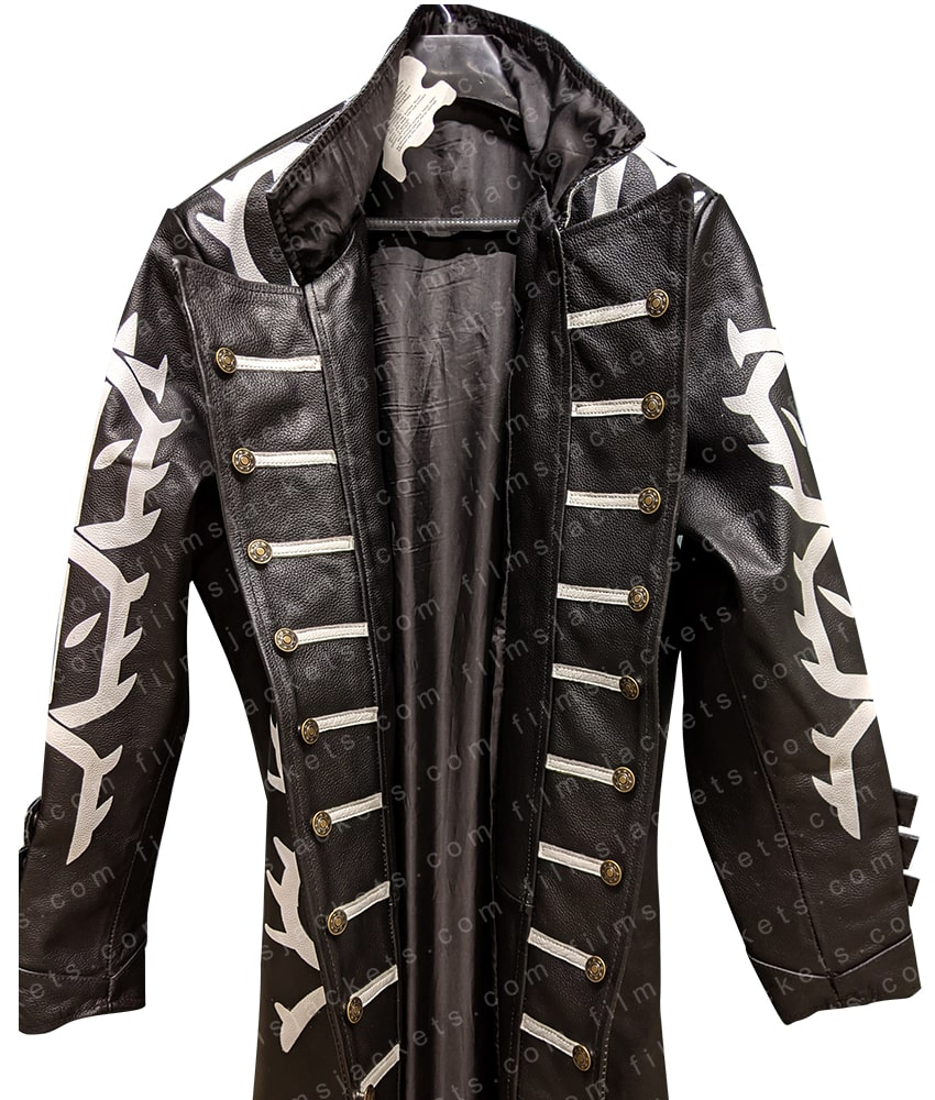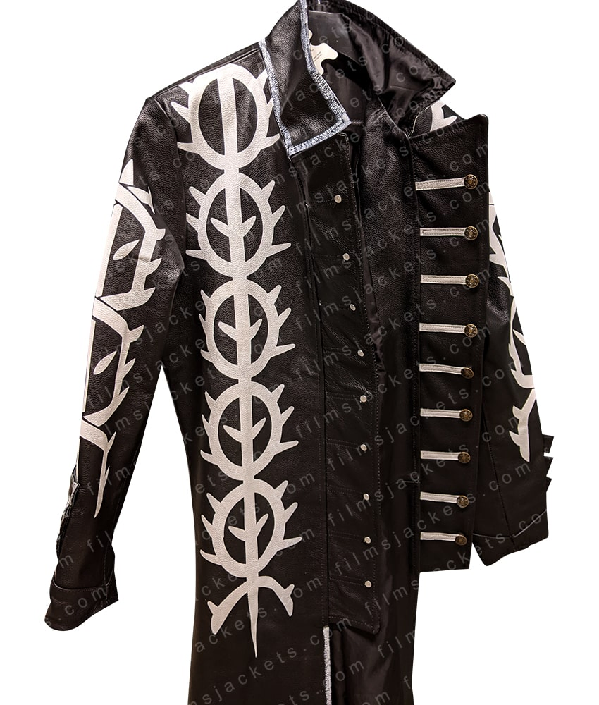 DMC 5 Vergil coat was worn in the addictive and most played video game titled as “devil may cry”. The coat was worn in this game by the game character. This fabulous coat is made from premium quality faux leather material with internal soft viscose lining. The coat comes in black color. Vergil trench coat has front open style closing with metal button design. The coat has a high stand-up style impressive collar. It comes with long length style sleeves on open hem style cuffs. The leather coat has white designing on the front, back and on the sleeves of this mesmerizing leather coat.