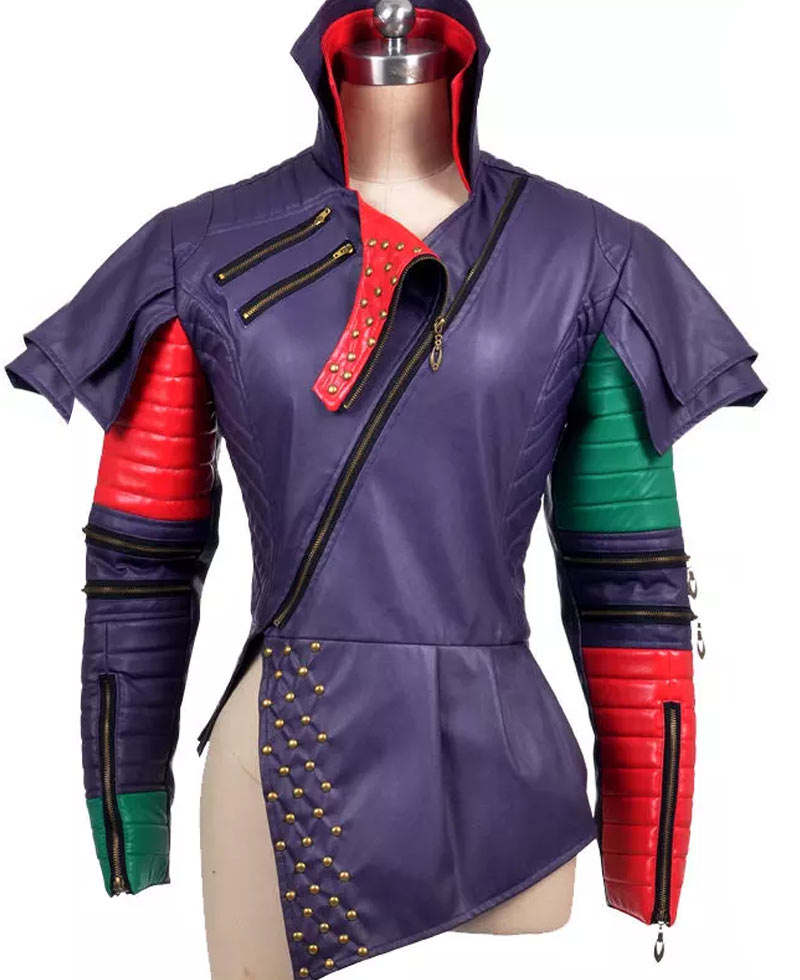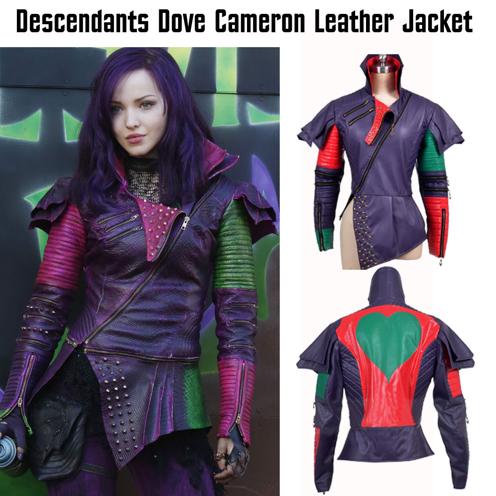 Dresses which make you eye-catching always remain in the fashion list like Mal Jacket. The inspiration of this binding apparel has been taken from the popular movie named as “Descendants 2”. The topic of the film is the adventure. The fictional character Mal has worn this outfit. Actress Dove Cameron who lives in the hearts of unlimited people wore Descendants Jacket in the same film. Her appearance insisted ladies to copy her style. Best grade faux leather is used to make the external part. The purple shade is unusual and mostly females like it. High stand collar is given in a new style. We assure you that you have never been this kind of jacket before. Mal Descendants Jacket has red and green shade in both sleeves. Two slanted zipper pockets are present on the right chest. Metal button designing is enhancing the beauty. Sleeves have zipper cuffs.