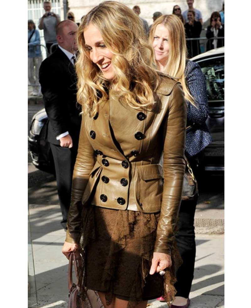 Double Breasted Sarah Jessica Parker Olive Green Leather Jacket