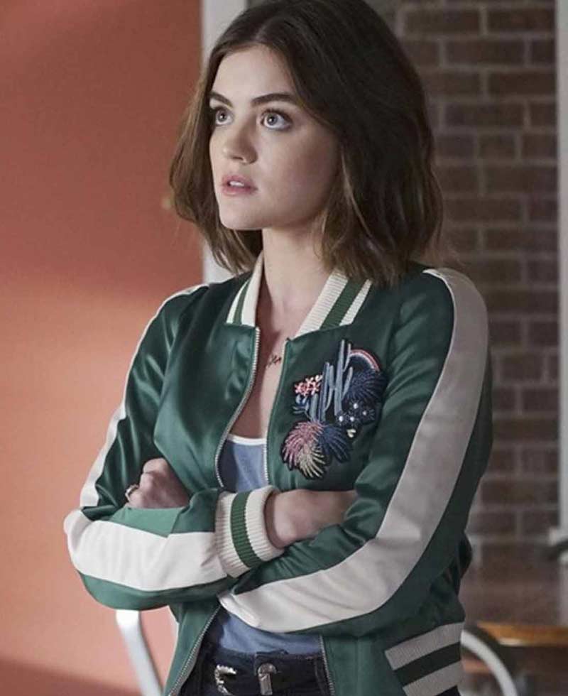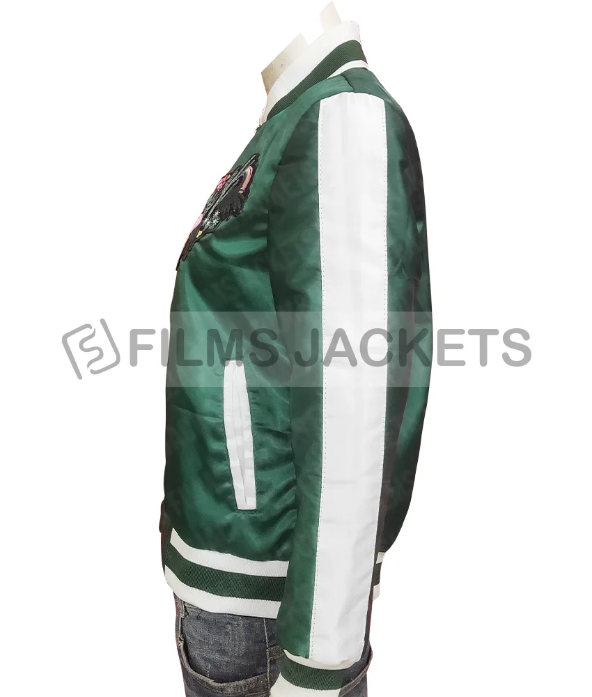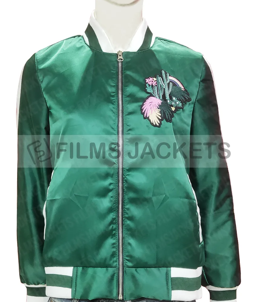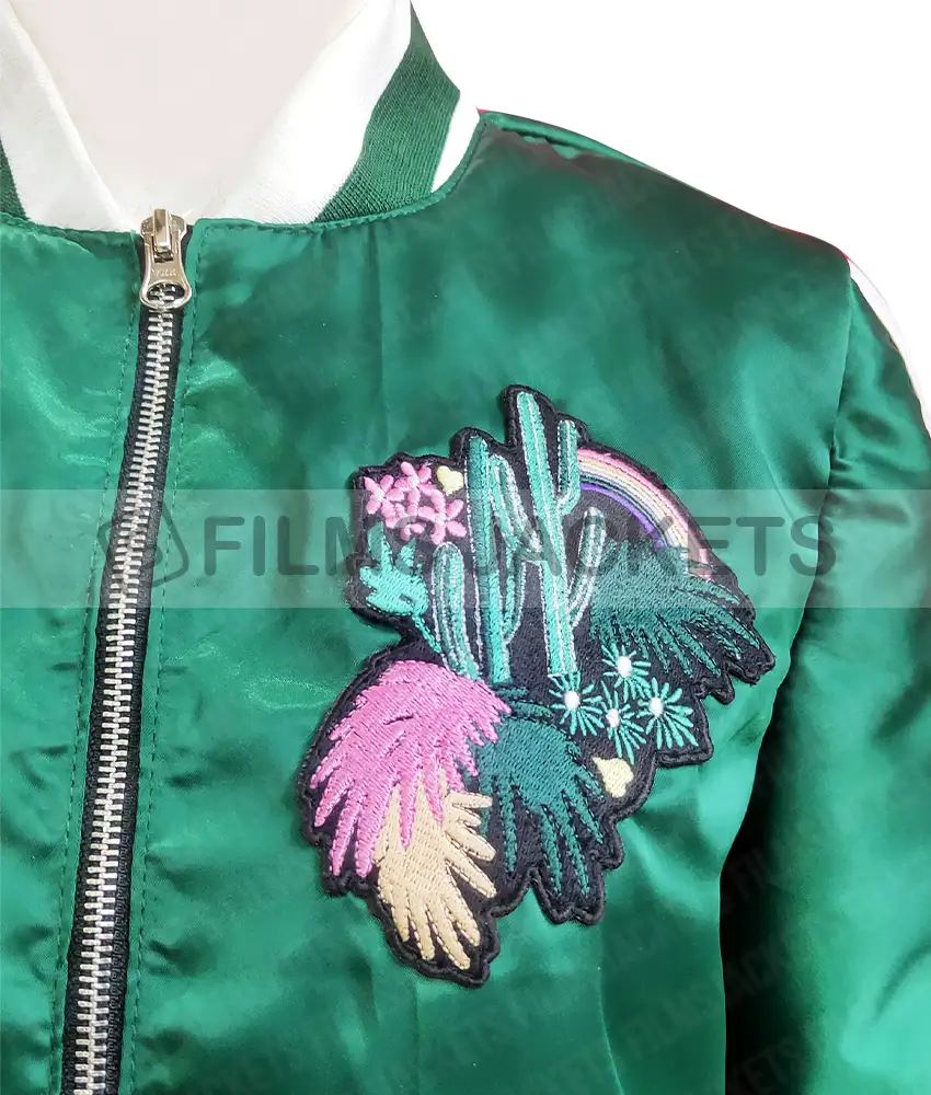 Eleanor shellstrop jacket is made from high quality satin material and is very comfortable in wearing because of the inner soft viscose lining. This jacket will keep you warm in cold weathers. The good place kristen bell jacket has a glitzy green color. This jacket has a rib knitted shirt style collar with rib knitted cuffs on full length sleeves. The front ykk zipper closure fits perfectly with the style of the jacket. This jacket has a rib knitted hemline along with cactus plant logo on the chest.