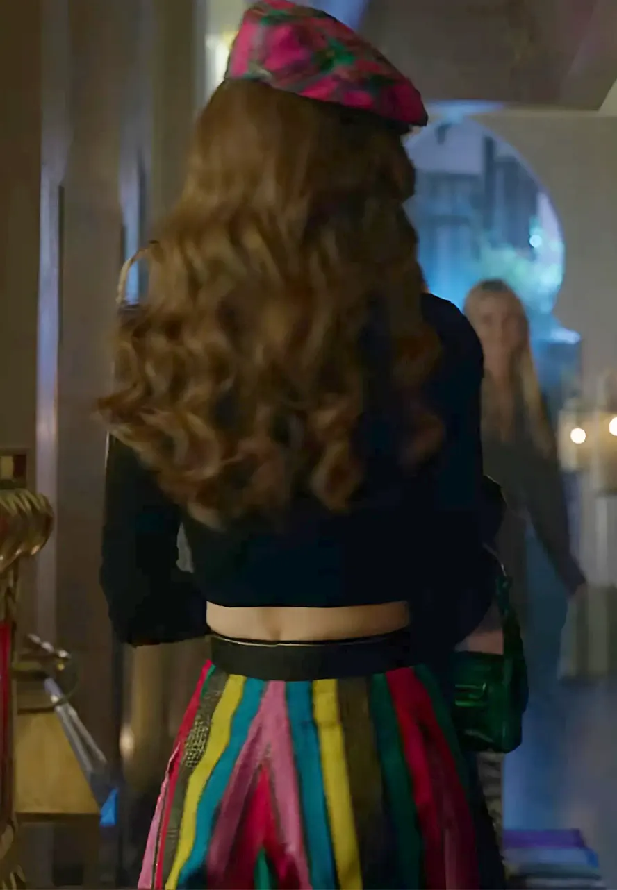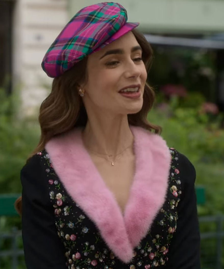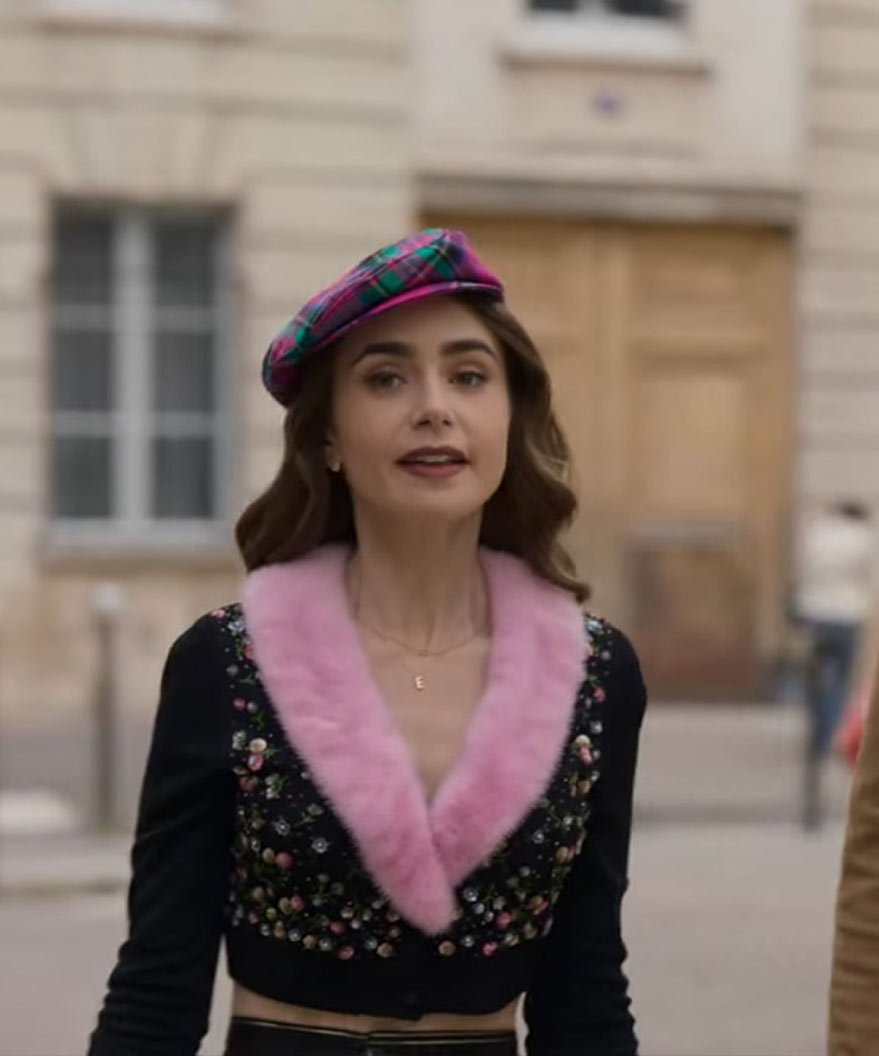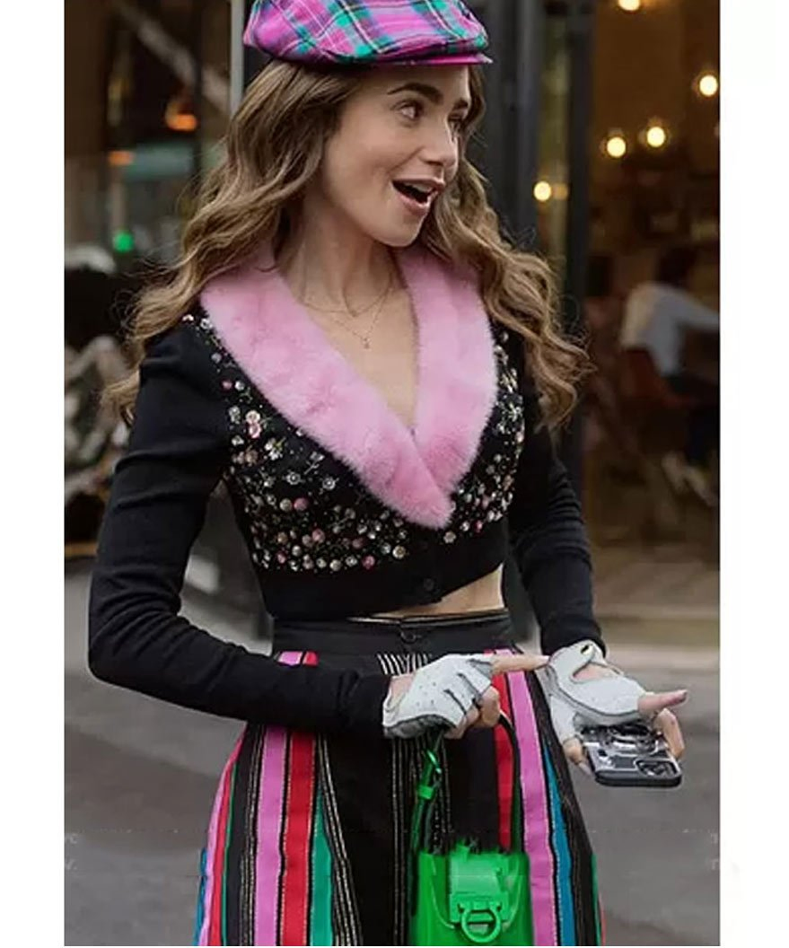 Tv Series Emily In Paris S2 Lily Collins Fur Collar Black Cardigan