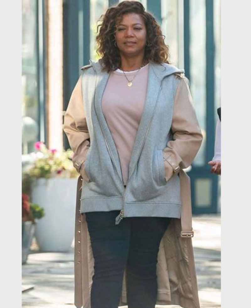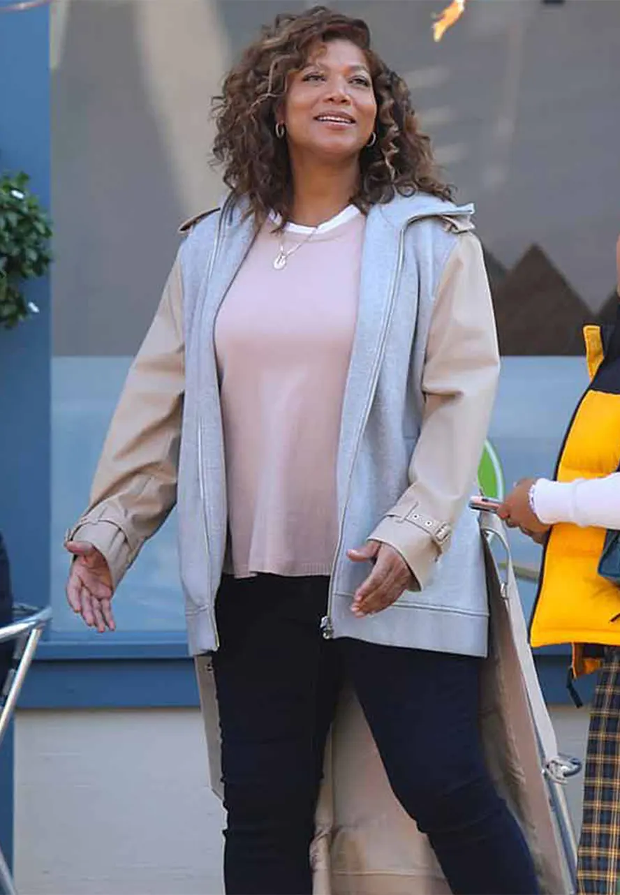 The idea of this look is taken from the American popular 2021 action thriller movie called The Equalizer where the actress Queen Latifah wore this tailcoat when she was portraying the character of Robyn Mccall. The external side of this tailcoat is made by using two top-quality fabrics, cotton, and fleece. The fine quality stitching makes this coat durable to wear. The Equalizer Queen Latifah tailcoat has an internal lining of smooth and soft viscose attached. The coat comes in a pink and grey color combination. There is a ykk branded zipper attached to the front side of this Robyn Mccall tailcoat for the closure. The coat has a belted fastening as well. There are belted style cuffs on the full length sleeves of this tailcoat. The Robyn Mccall tailcoat has two front waist pockets. The hooded collar looks catchy. The coat comes with a rib knitted hemline as well.Â