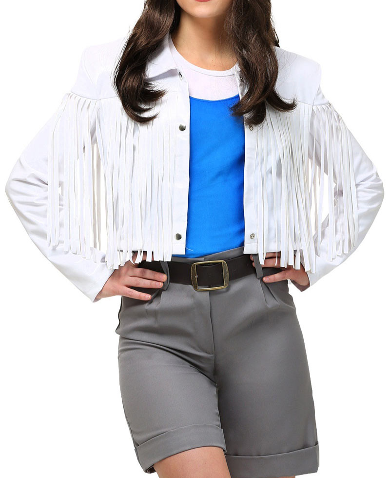 Fashion never ends; Sloane Peterson Jacket is the best example of this. The inspiration of the attire is taken from a drama movie named as “Ferris Bueller’s Day Off”. It was released in 1985 but the dresses of the film are still an essential part of the fashion industry. American actor Mia Sara has depicted the leading role of Sloane Peterson successfully. Sloane Peterson Leather Jacket has prepared from top class genuine leather or faux leather. Like other jackets rayon fabric is added internally. The pure and holy white color has made it engaging. The important feature of the outfit is the addition of fringes on front and sleeves. The frontal closure is connected with metal buttons. Ferris Bueller’s Day Off Mia Sara Jacket has shirt collar. Slim and long sleeves are looking alluring. At the end of sleeves open hem cuffs are given. Now a day it is number one choice of every lady.