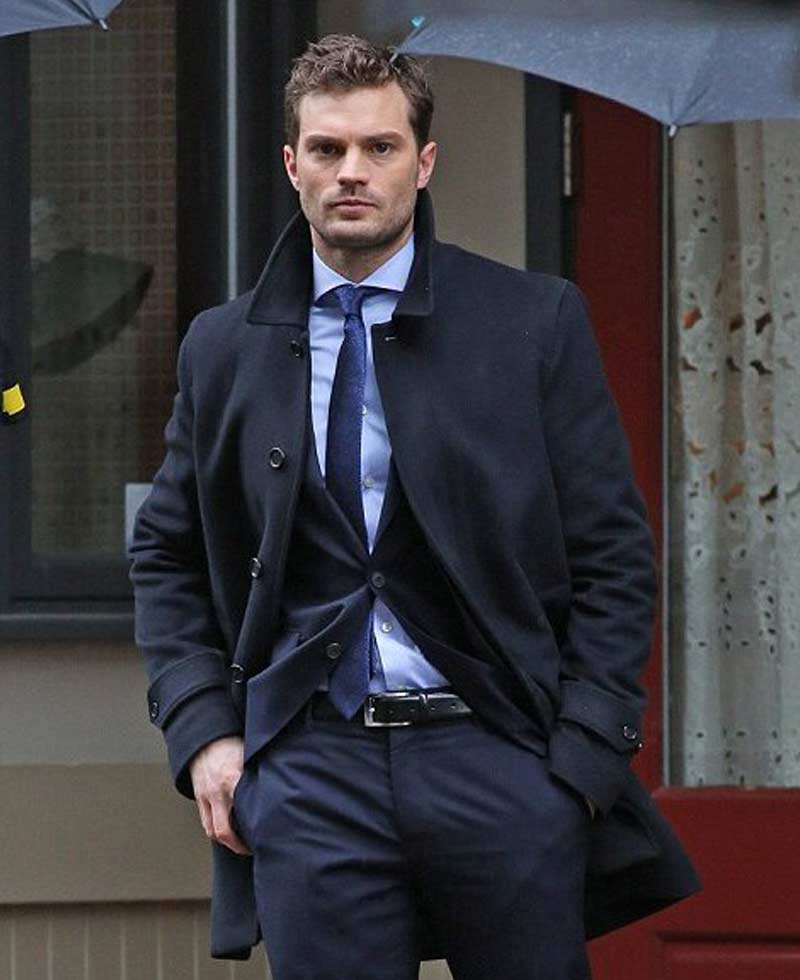 Christian grey coat is made from high quality wool material. This coat has been especially manufactured to keep you comfortable whether you wear this coat all day long. It will keep you warm in cold weathers. This coat has inner soft viscose lining that makes it very comfortable in wearing. Fifty shades freed jamie dornan coat has a shirt style collar. This coat has a front double breasted buttoned style closure that is no doubt increasing the beauty of this coat a lot. This coat has full length sleeves with open hem buttoned cuffs. It consists of pockets in which you can put your thing in. it has large side pockets. This jamie dornan coat is available here in a black rich color. You can get this now by just following simple steps to order. Order now and wear this lovely coat.