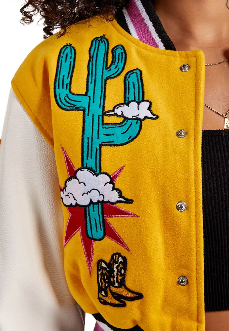 Now Shop the First Row Wild And  Free Yellow Varsity Jacket to Add a Good Touch of Elegance to Your Wardrobe and Always Look Highly Fashioned While Wearing This Timeless Jacket to Exude Charm. The First Row Cropped Varsity Jacket Has Been Fabricated by Premium-quality Wool to Make It Warm and Ageless, While Its Soft Viscose Inner Makes It Comfortable and Moisture-free. The Combination of Yellow and White Colors Makes It Charming. The First Row Wild & Free Yellow Jacket Has Been Designed by Using All Smart Features Like a Rib-knitted Stand-up Collar, Snap Tab Buttoned Closure, Rib-knitted Cuffs and Hemline, and Side Waist Pockets to Keep Your Small Accessories. The Yellow Varsity Jacket is a Versatile Outfit That Pairs Perfectly With Any Ensemble.