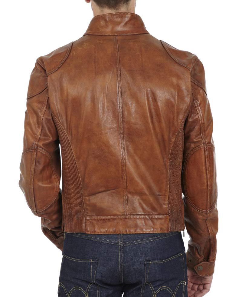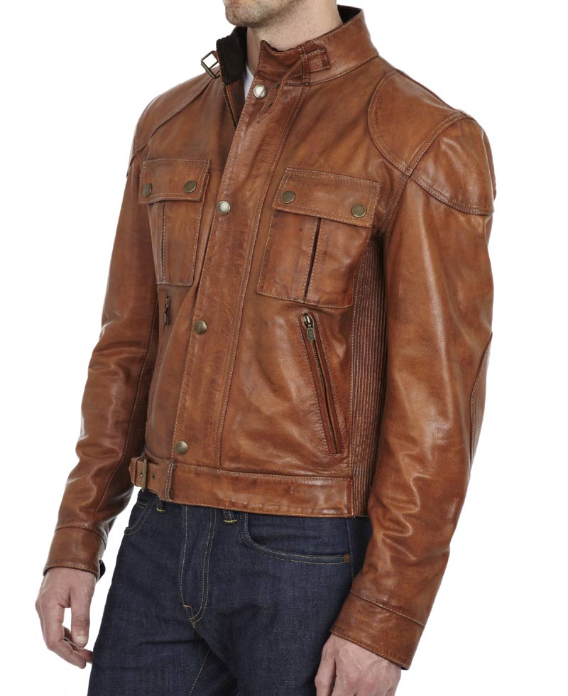 Men’s brown leather biker jacket is a posh and vintage designed jacket which is neatly stitched and perfecting line up accordingly. Gangster leather jacket is available in genuine leather which is interiorly lined up by viscose material. The men’s brown leather biker jacket is stitched up in snap tab collar with a buckle and a buckle strap at the waist line for adjusting the fitting of the jacket as it is a slim fit jacket; snap tab cuffs are also present. The color of the gangster leather jacket is brown with vent decoration in underarm also is equip with a metal belstaff logo on the left side of the arm. The closure of the men’s brown leather biker jacket is with round copper color button beneath with zipper detailing and two slant zipper with two button pocket at upper side of chest which provide it a classy outlook.
