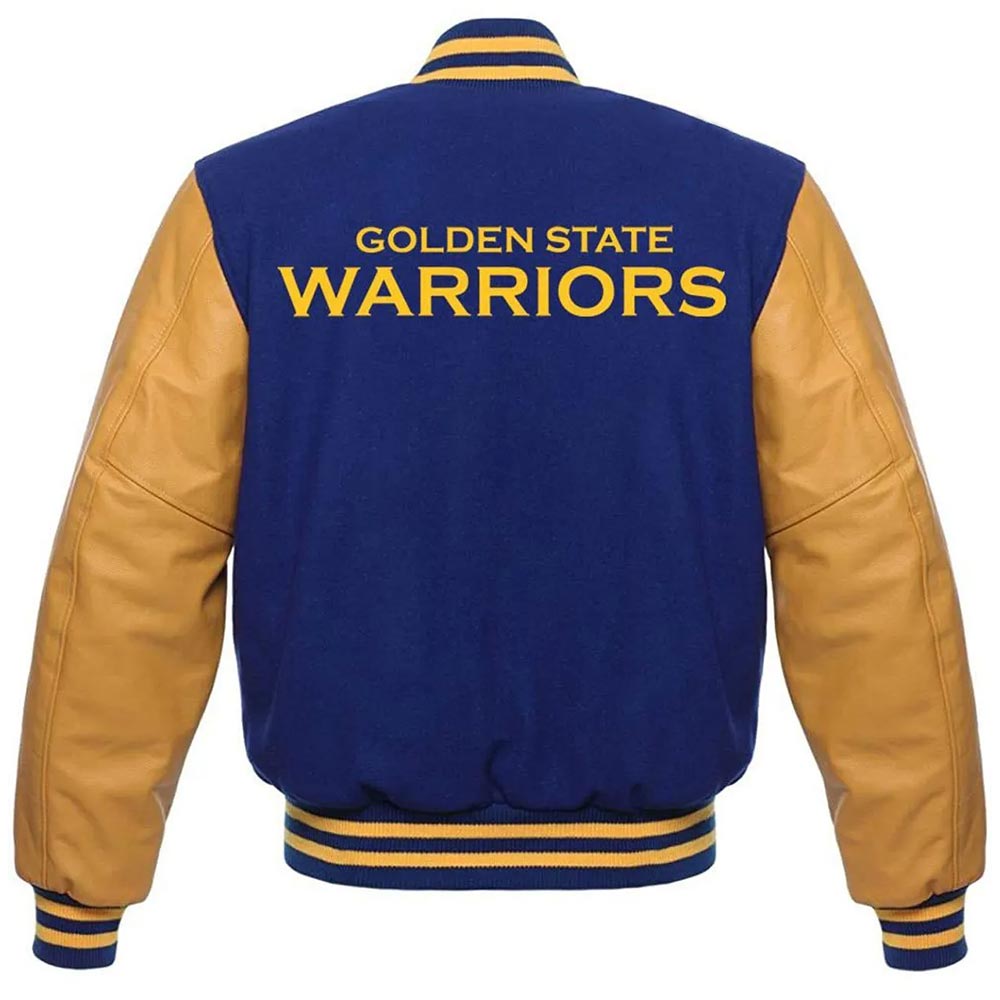 The Golden State Warriors Varsity Jacket is Like a Symphony of Style and Function, It Will Elevate Your Casual and Formal Look, You Can Wear It at Social Events or Business Meetings Too. Its High-quality Wool Fabrication Makes It Warm and Ageless Along With Its Soft Viscose Inner Will Comfy You as Long as You Wear It. The Combination of Blue and Yellow Colors Makes It Vibrant. The Golden State Warriors Bomber Jacket Has Been Styled by Using All Smart Attributes Like a Rib-knitted Stand-up Collar, Snap Tab Buttoned Closure, Rib-knitted Cuffs, and Hemline and Side Waist Pockets. The Golden State Warriors Jacket Will Accompany You for Ages With a Lot of Grace.