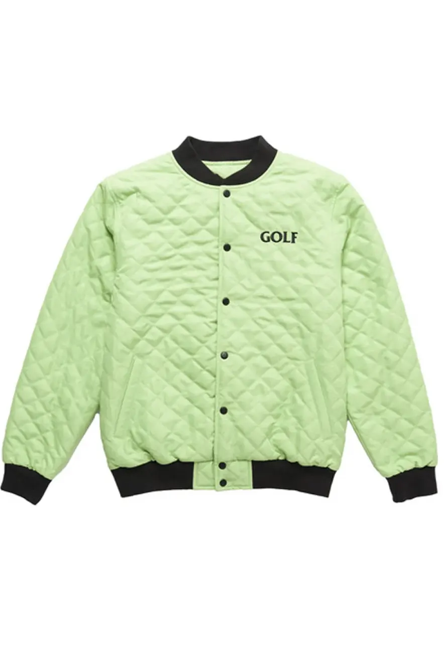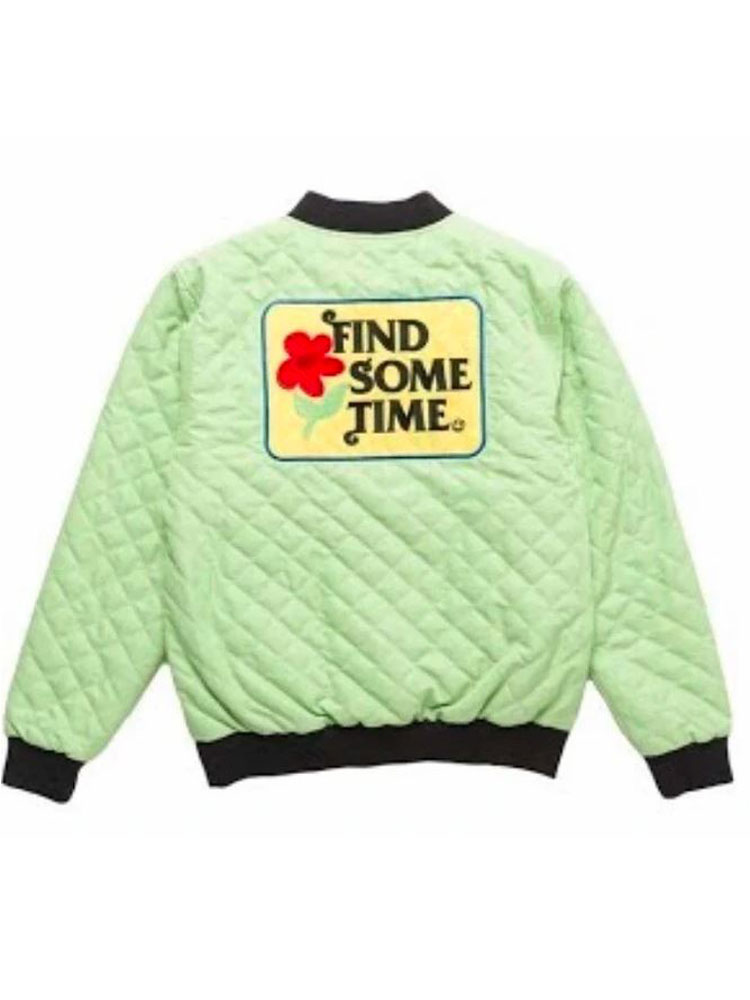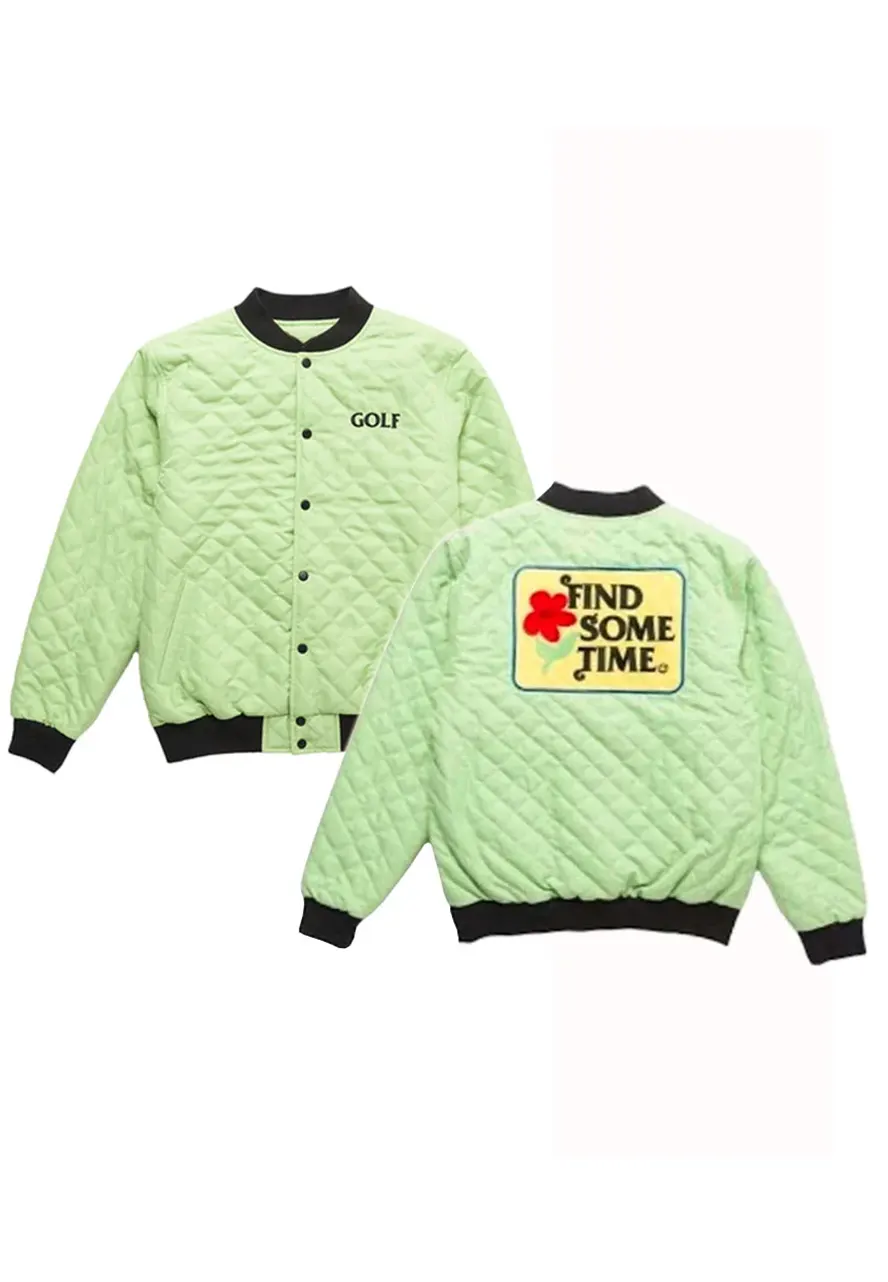 The external side of this quilted-style bomber jacket is fabricated by using top-quality polyester material. The inner side of this Find Some Time jacket is covered with a smooth and soft viscose lining that guards you against cold weather and keeps you warm and comfortable. The jacket comes in an appealing black or green color. There is a ykk branded zipper attached to the front side of this Find Some Time jacket for the closure. The jacket has an erect-style rib-knitted collar as well. The Golf Find Some Time jacket has two front waist pockets where you can secure stuff. The jacket comes with rib-knitted style cuffs on full length style sleeves. The quilted pattern on this bomber jacket looks so divine. There is a Golf logo on the chest of this bomber jacket as well. The jacket comes with a rib-knitted hemline. There is a Find Some Time patch on the back of this jacket.