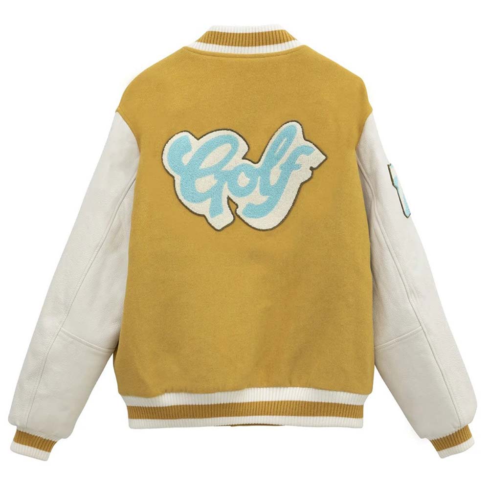 The golf wang dirt letterman jacket adds a touch of timeless charm to your wardrobe and creates an elegant and iconic look for you. Its premium quality wool fabric makes it warm and ageless; its soft viscose inner will keep you restful and sweat-free. The combination of Golden and white colors makes it eye-catching. The golf wang dirt Letterman varsity jacket has attributes like a rib-knitted stand-up collar, snap tab buttoned closure, rib-knitted cuffs and hemline, and side waist pockets. The golf wang dirt varsity jacket will leave you with both classy and contemporary looks and stand you out from the crowd.