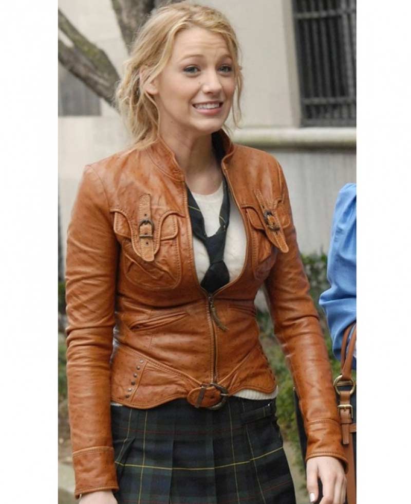 Serena van Der Woodsen is the main character of super hit novel series gossip girl. She has an attractive personality and also takes place in the heart of viewer by her acting and outfits are also outstanding. We are presenting replica of Serena van Der Woodsen leather jacket. Made from high quality real leather with viscose lining inner. The front has stand up collar with zip closing. Gossip girl Blake lively jacket has four pockets two flap pocket present on chest with buckle detailing and two diagonal pockets on waist. The sleeves are fitted with zipper cuffs designed in fabulous brown color. The most dominant feature of the attire is adjustable waist buckle belt on waist makes stunning to girl Blake lively gossip leather jacket.