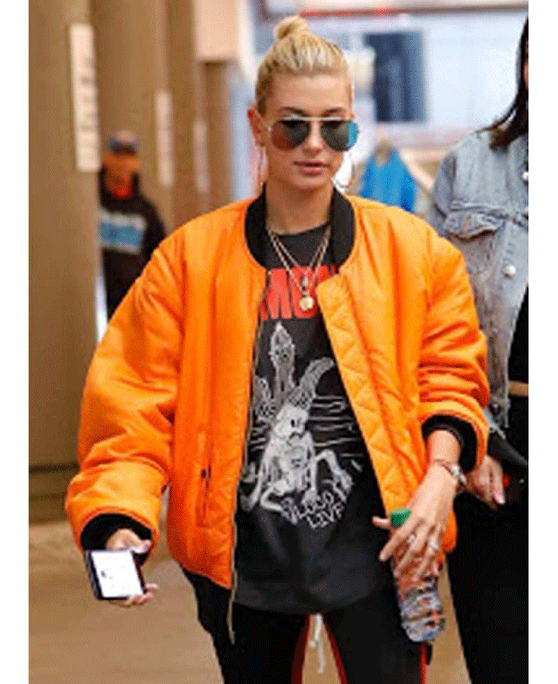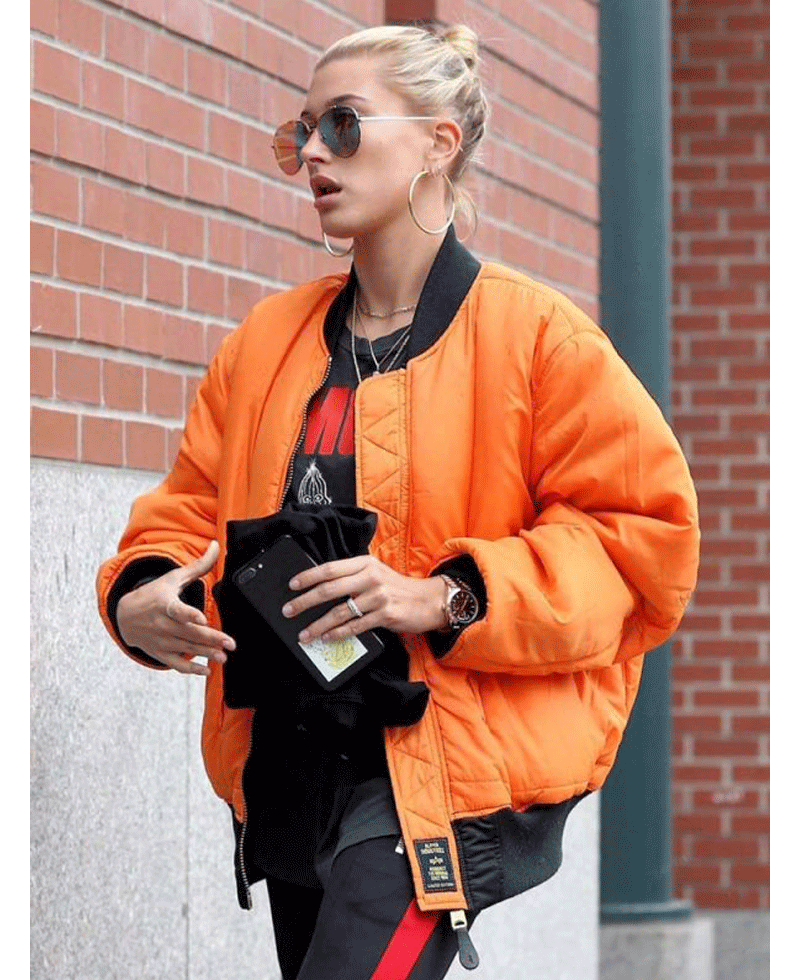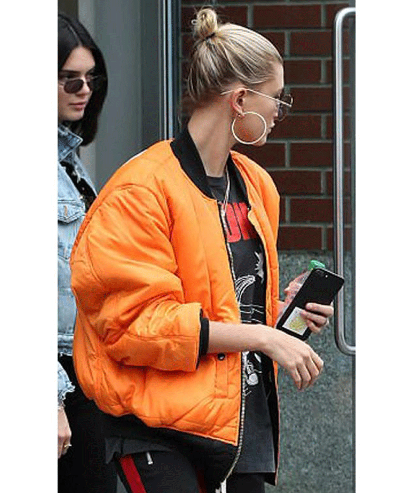 The idea of this stylish oversized bomber jacket is inspired from the talented model and television personality Hailey Baldwin. She wore this jacket and inspired almost all the girls out there. The Hailey Baldwin bomber jacket is fabricated from parachute material and the material used is of finest and lasting quality. On the inside of this jacket, soft and comfortable viscose lining is attached that keeps you warm and comfortable all the time. Hailey Baldwin Orange jacket has rib knitted style cuffs on full length style sleeves. It has rib knitted hemline and a rib knitted style collar. On the front of this jacket, there is a ykk branded zipper for the closure. The jacket looks perfect with the two front side waist pockets where you can keep your handy stuff.