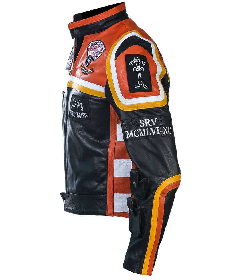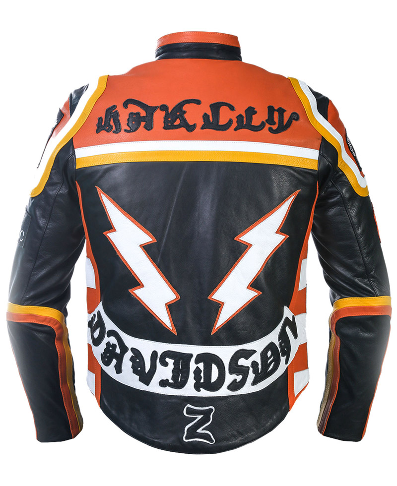 The inspiration for the Harley Davidson and Marlboro Man jacket has been derived from the Mickey Rourke outfit. The winsome combination of black and orange shades. Made in genuine leather and the comfortable lining has made it too relaxing. The collarless style with a button is really. You will find a new and attractive feature in the Harley Davidson and the Marlboro Man leather jacket, which are patches. Yellow and white stripes are increasing the charm.