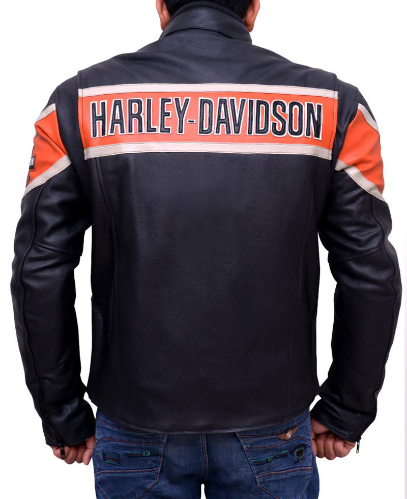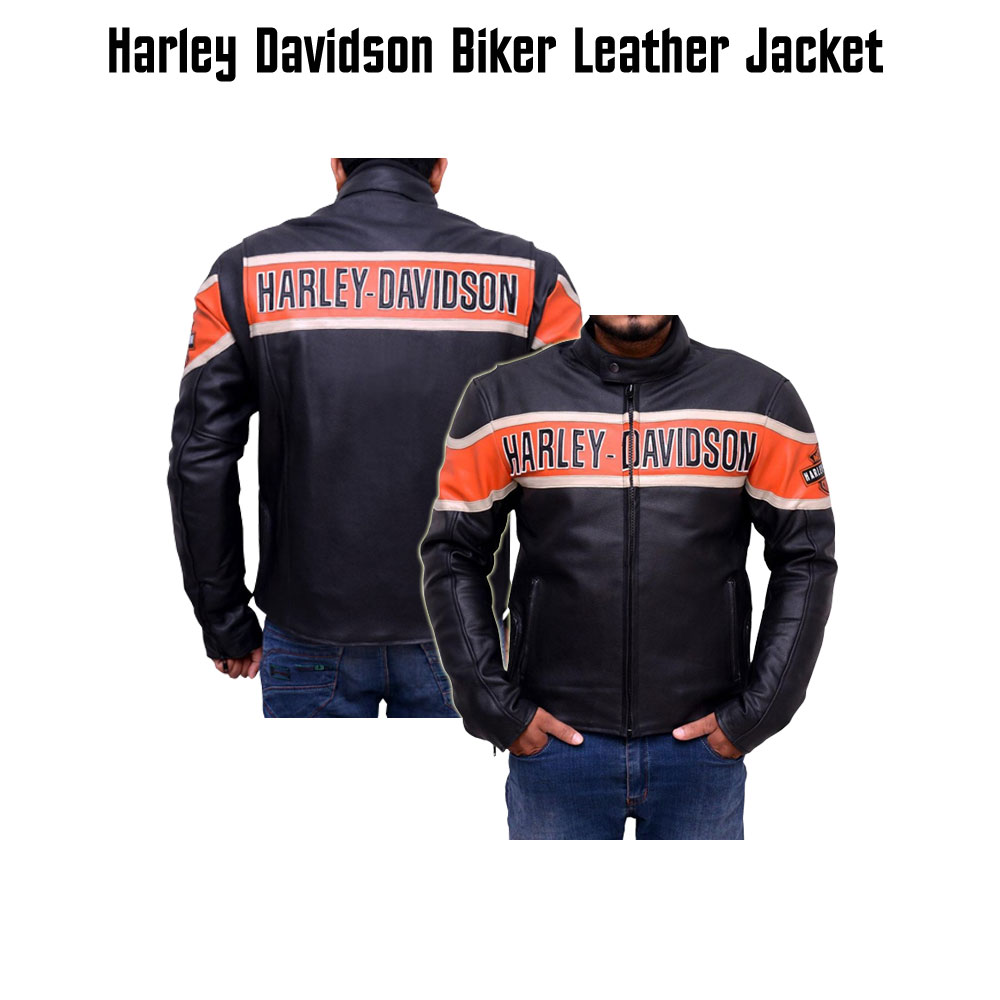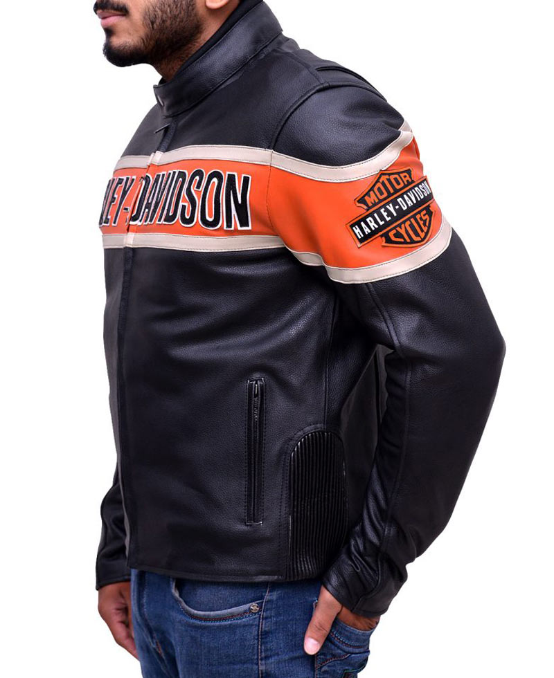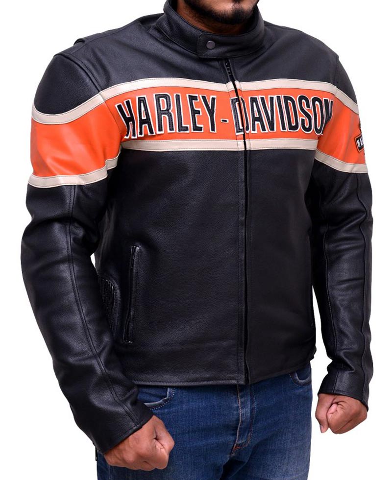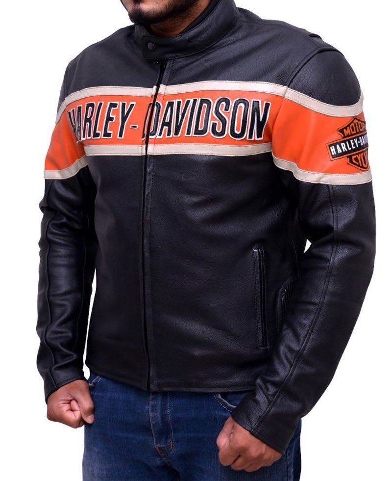 Harley Davidson Victory Lane Jacket is prepared from best class genuine leather. The front zipper conclusion is connected with zip. The snap tab button style collar is increasing exhilarating impression. Enticing Victory Leather Jacket has inner soft viscose lining. Two side waist zipper pockets and two inner pockets are present. Word “Harley Davidson” is written on back and chest of the attire. Long sleeves are long and apt. Victory Lane Leather Jacket has viscose internal lining.  Zipper cuffs are making you smarter.