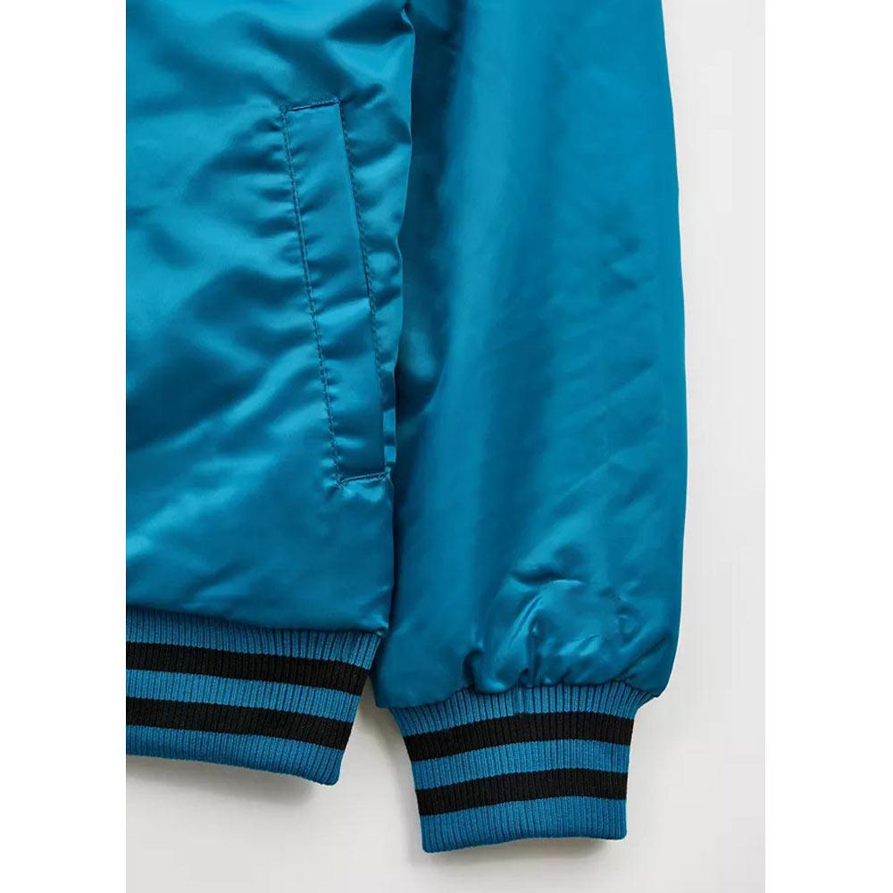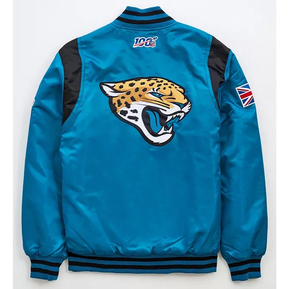The Jacksonville Jaguars Varsity Jacket Looks Absolutely Stunning and Luxurious, It Adds a Touch of Sophistication to Your Outfit. Its First-rate Satin Fabrication Makes It Light Weighted and Wearable in All Seasons Furthermore Its Soft Viscose Inner Will Comfy You as Long as You Attire It. The Elegant Blue Color Looks Fantastic on You. The Jacksonville Jaguars Varsity Satin Jacket Has Been Designed by Using Attributes Like a Rib-knitted Stand-up Collar, Snap Tab Buttoned Closure, Rib-knitted Cuffs, a Truly Impressive Hemline, and Side Waist Pockets. The Jacksonville Jaguars Jacket Has Incredible Craftsmanship That Will Never Go Out of Fashion and Add a Good Amount of Glamour. Now Head Out Handsomely Wherever You Go!