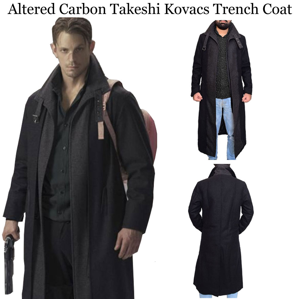The idea of this coat is taken from the famous American web television drama series called Altered Carbon where the famous American actor Joel Kinnaman wore this coat when he was portraying the character of Takeshi Kovacs. The external side of this coat is fabricated with wool material of premium quality. On the internal side of this Joel Kinnaman Altered Carbon trench coat is a lining of smooth and soft viscose that keeps you warm and comfortable all the time. The coat comes in black color. There is a shirt style collar on this coat with belted straps. Takeshi Kovacs coat has two front waist pockets and two inside pockets where you can secure stuff. The coat has open hem style cuffs on full-length style sleeves. The front open look of this trench coat makes it more appealing to wear.