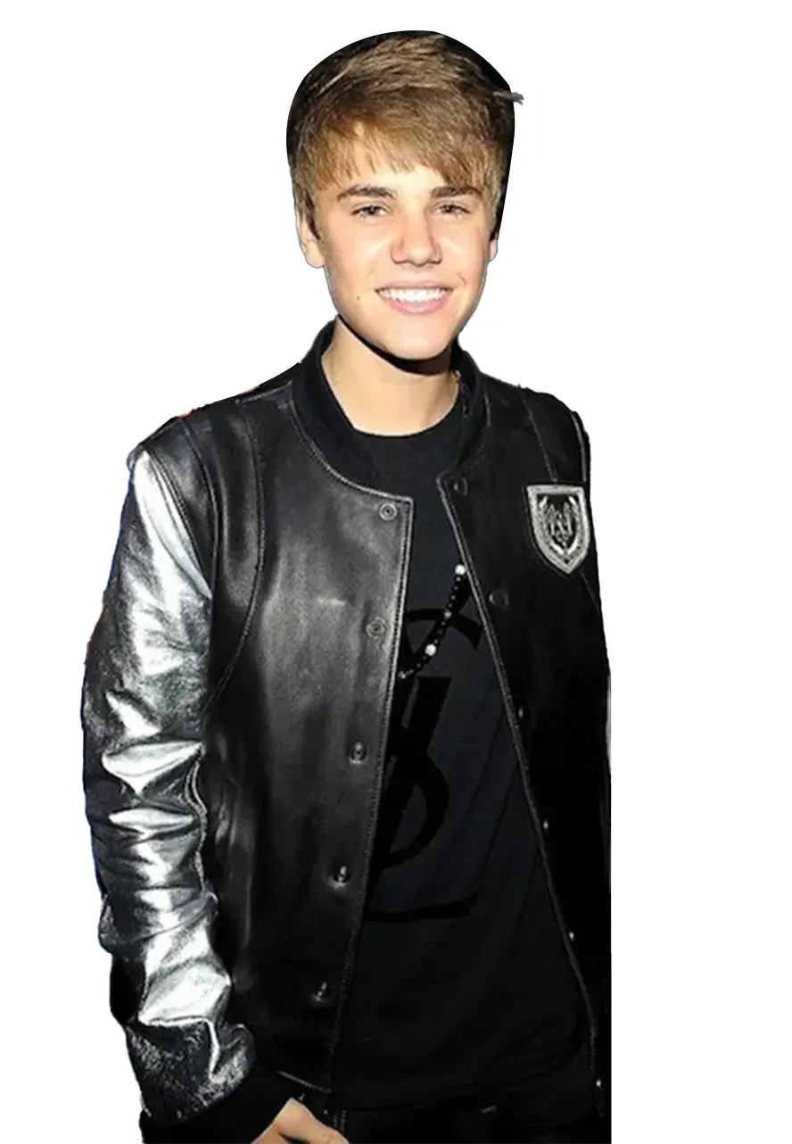 The Justin Bieber Black and Silver Jacket Exudes an Aura of Timeless Charm and Coolness. This Justin Bieber Varsity Jacket Will Accentuate Your Sense of Style and Fits You Well. The Dapper Jacket Has Been Fabricated by Premium-quality Leather to Make It Warm and Luxuriant, While Its Soft Viscose Inner Will Comfy You all long. The Combination of Black and Silver Colors Will Give You Unique Looks. The Black and Silver Varsity Jacket Has Been Designed by Using All Smart Features Like a Rib-knitted Stand-up Collar, Snap Tab Buttoned Closure, Rib-knitted Cuffs and Hemline, and Side Waist Pockets to Make It More Functional. The Black and Silver Jacket Will Give You a Combo of Edgy Attitude and Refined Charm.Â