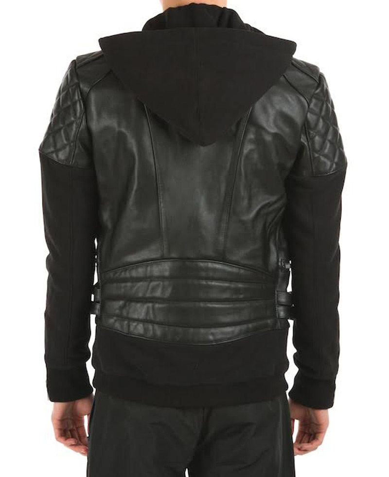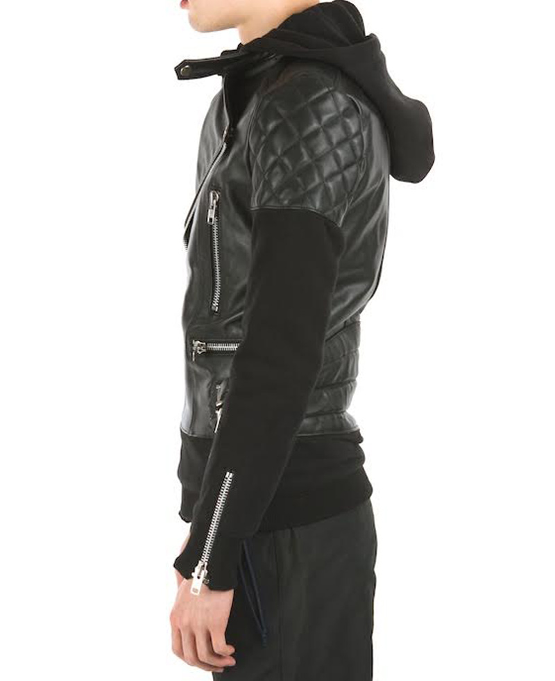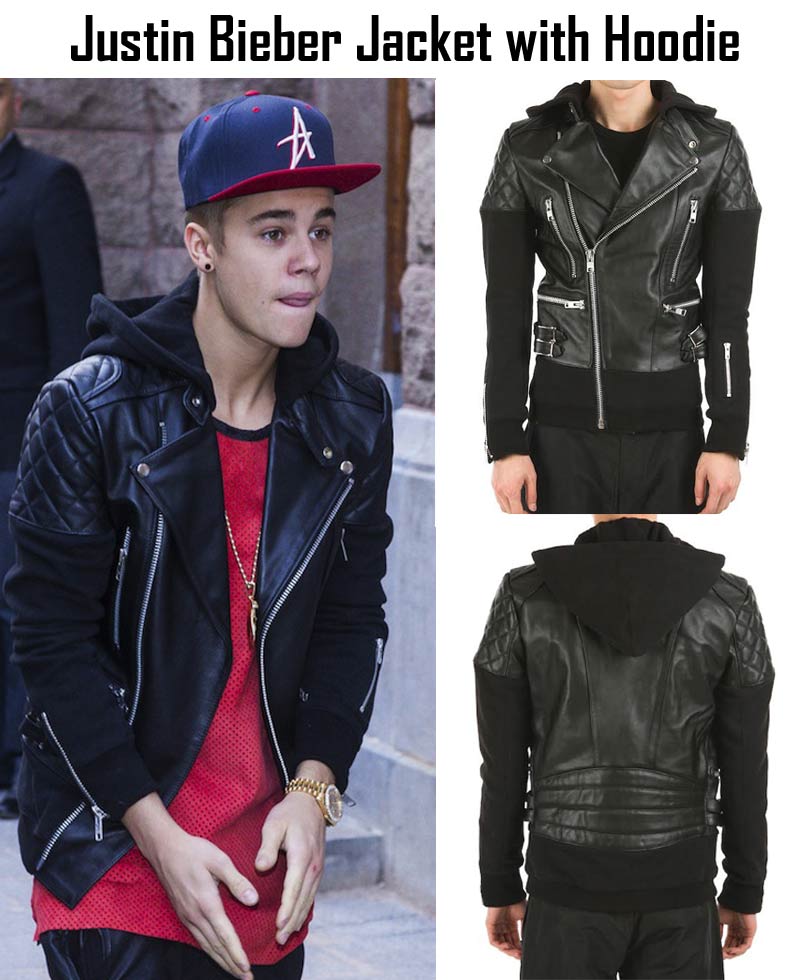 The younger vocalist Justin Bieber dressed unique Justin Bieber Leather Jacket With Hoodie and his fans become crazy of his style. The outer shell is prepared from the combination of jersey and genuine leather. It is a new design which you have not worn before. The inside portion is decorated with soft inner lining. Black shade has made it an ideal outerwear. Asymmetrical zipper front shutting down has enhanced the beauty. The neckline is given in lapel form. Justin Bieber Jacket With Hoodie quilted pattern on arms and shoulders. The sleeves and lower part of the attire is prepared from jersey. Hoodie is also made from same jersey. Two diagonal zipper pockets are given on chest and two horizontal zipper pockets are also included. Double adjustable straps are present on waist for accurate measurement of your waist. Both sleeves are in slimming look and have zipper cuffs.