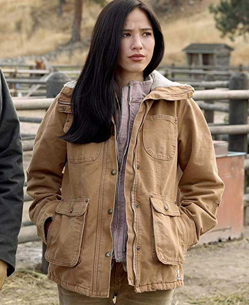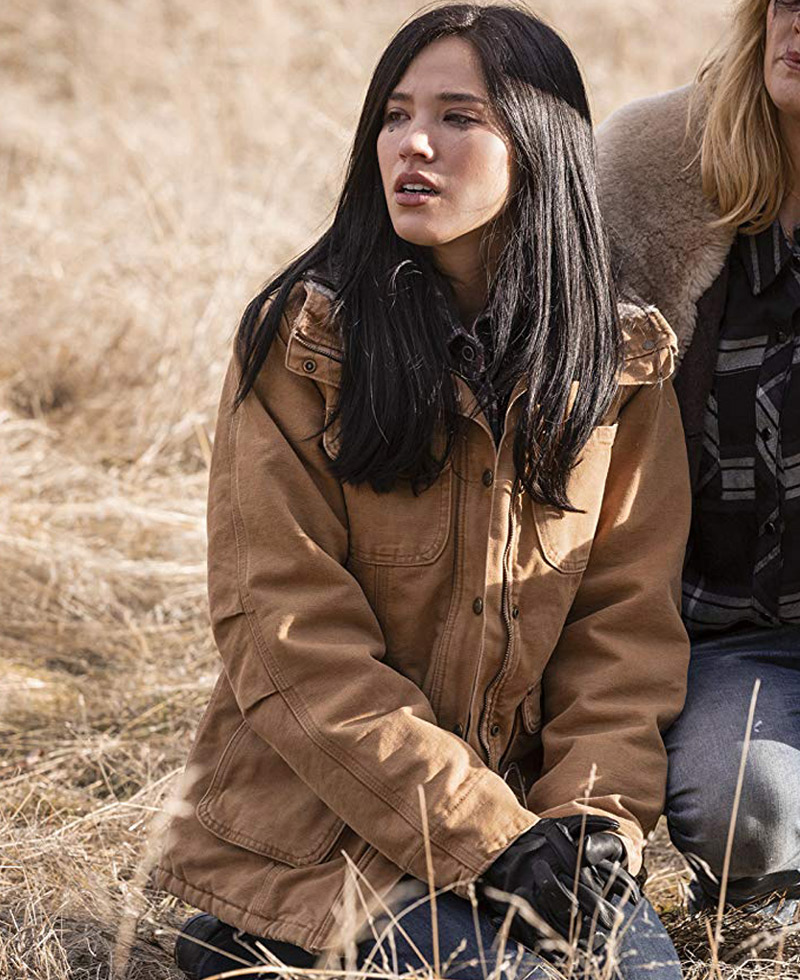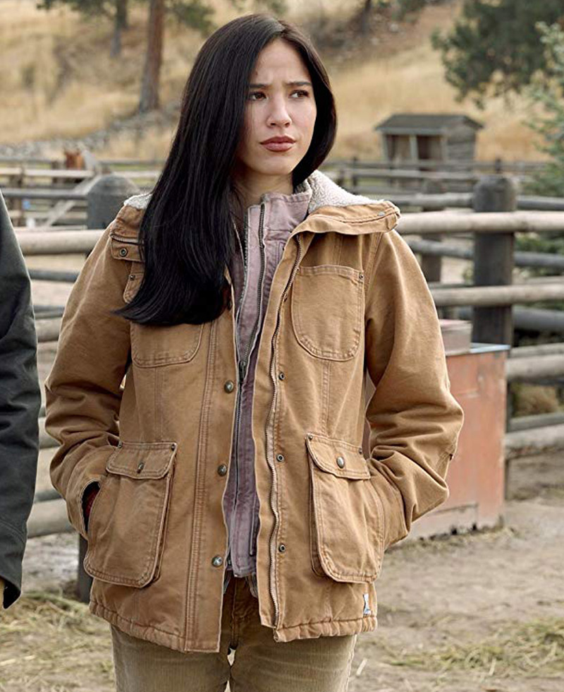 Monica Dutton jacket idea is taken by a famous and binged watched American television drama series titled “Yellowstone” where the talented actress Kelsey asbille wore this mesmerizing jacket. This jacket is fabricated from top quality cotton material. On its inner side, you will find very comfortable lining stitched that will give you a warm and cozy sensation. It comes in a khaki color. Yellowstone Kelsey asbille jacket comes with the front snap buttons over the branded zipper for closing. It has long length sleeves on buttoned cuffs. The simple shirt style fur collar makes the looks of this jacket more appealing. On the front, you will find two chest pockets and two side waist flap pockets for keeping stuff.