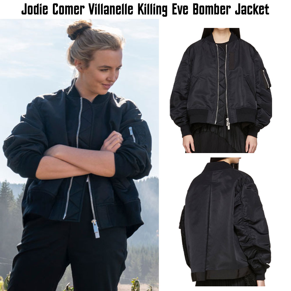 The gorgeous and talented British Actress Jodie Comer while depicting the character of Villanelle in the British popular black comedy television drama series called Killing Eve wore this jacket. The external side of this jacket is manufactured with high and premium quality of satin material. On the internal side of this apparel, there is a smooth and soft viscose lining that will keep you warm and comfortable the entire time. The jacket comes in black color. Villanelle black bomber jacket comes with front ykk branded zipper style closure. It has two front side waist pockets along with a single left sleeve zipper pockets. Jodie Comer Killing Eve Black bomber jacket comes with an erect style collar. It looks attractive on full length style sleeves on rib knitted style cuffs. The Villanelle black bomber jacket has a rib-knitted hemline as well. This apparel is the exact replica of the original one. It is perfect for outings.