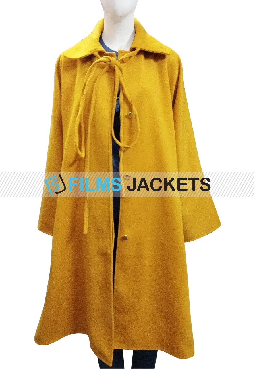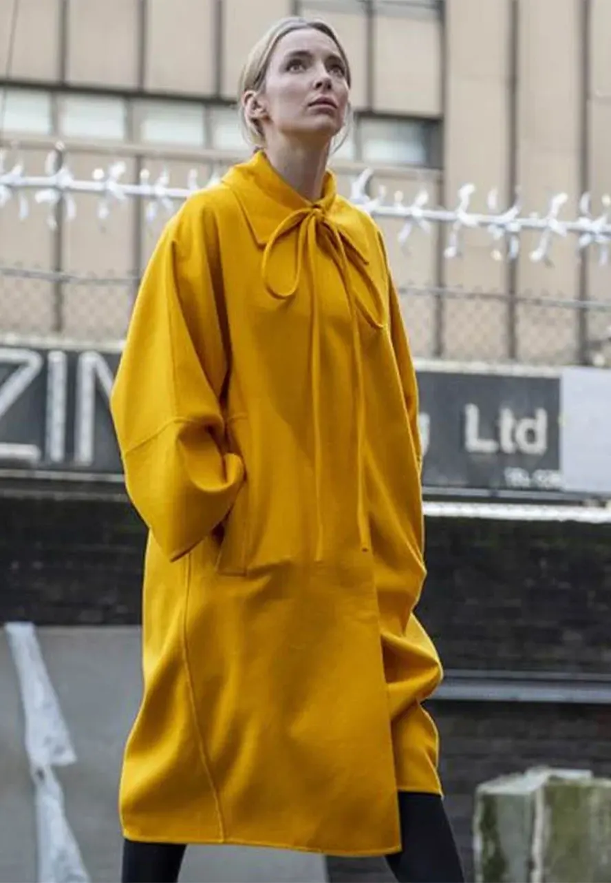 Villanelle yellow coat comes with a hidden button closure. It has a very mesmerizing appearance. It is long in length. Its vibrant yellow color makes it more appealing to wear. Villanelle yellow coat has open hem style cuffs on full-length style sleeves. This coat comes with two front waist pockets where you can secure stuff. Jodie Comer Killing Eve season 03 coat has a turndown style collar with drawstrings attached to it. This coat is a replica of the original one.