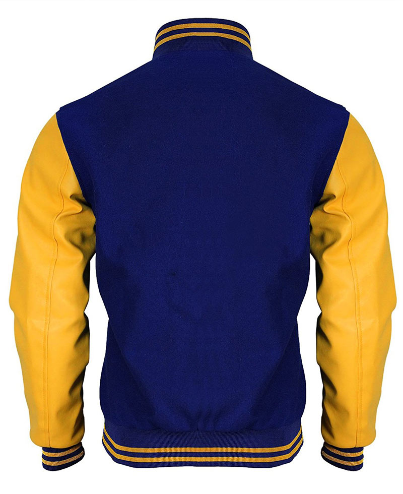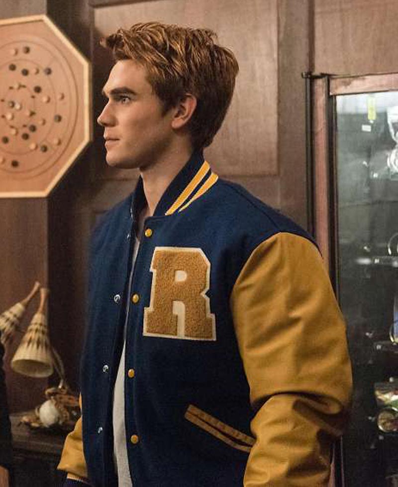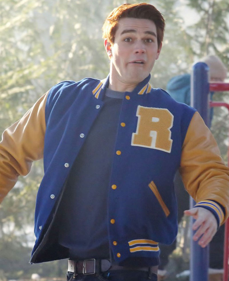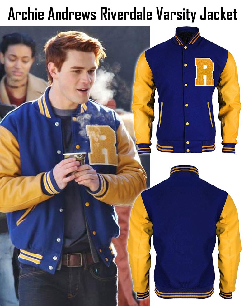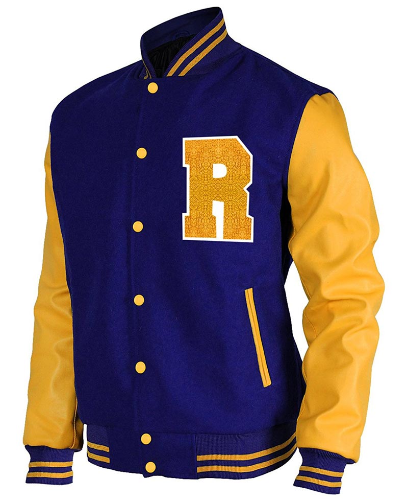 If you do not have Riverdale Jacket in your wardrobe you are not aware of the latest fashion. It is an impressive combination of two types of fabric; the woolen and the faux leather. Viscose inner lining has given comforts. Whole body of the attire is made from woolen fabric whereas both sleeves of Riverdale Varsity Jacket are prepared from faux leather. Blue and yellow are bright colors which has made the attire meaningful. Two side waist pockets are given. Front opening is connected with yellow buttons. Blue rib-knitted collar has yellow stripes. Riverdale Letterman Jacket has yellow sleeves with blue rib-knitted cuffs. Same blue rib-knitted with yellow stripes are added as hemline. Large “R” is present on the left chest.