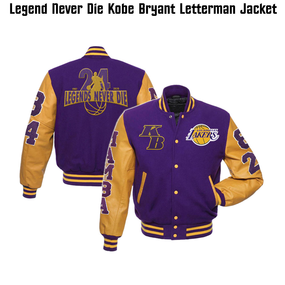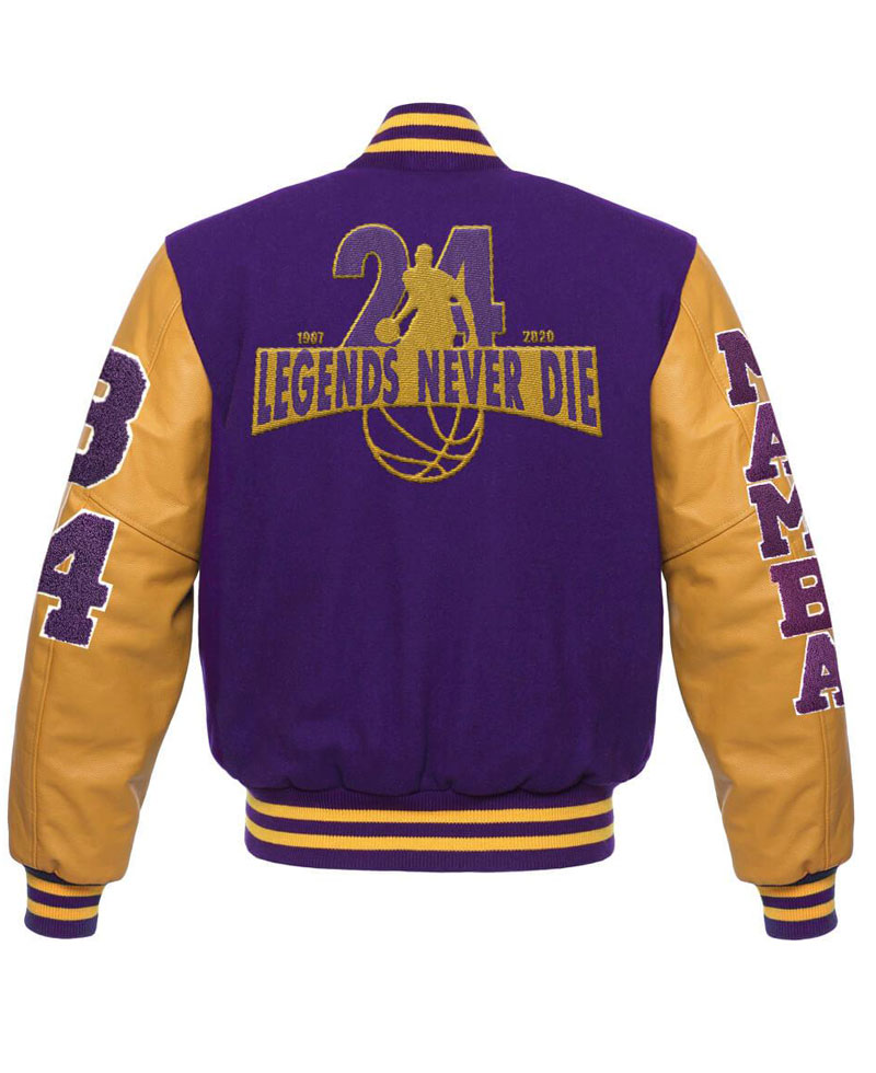 The idea of this letterman varsity jacket is taken from the late basketball player Kobe Bryant. The exterior of this Kobe Bryant Letterman Jacket is fabricated by using premium quality wool fabric. High-quality genuine leather material is used for making the sleeves of this jacket. The inner side of this letterman jacket is stitched with a smooth and soft viscose lining. The appealing yellow and purple color combo looks so desirable on this letterman jacket. Kobe Bryant mamba Los Angeles lakers varsity jacket has buttons attached to its front side for the closure. The jacket has an rib-knitted collar. There are two waist pockets on the front side of this Legend Never Die varsity jacket where you can secure stuff. The letterman jacket has rib-knitted style cuffs on full length style sleeves. The varsity jacket has a rib-knitted hemline as well.