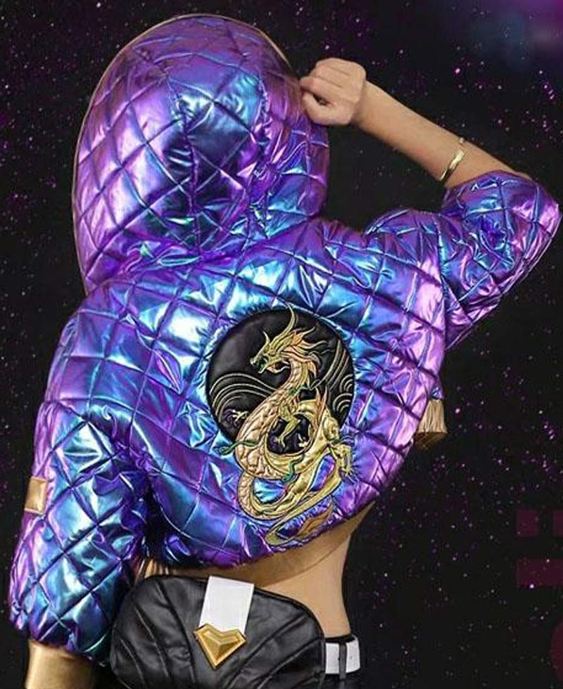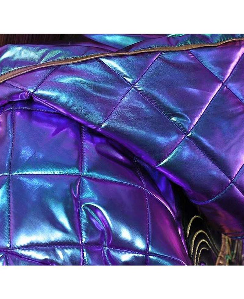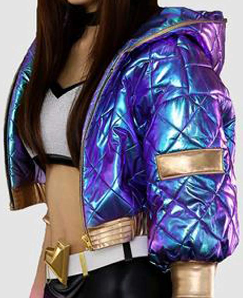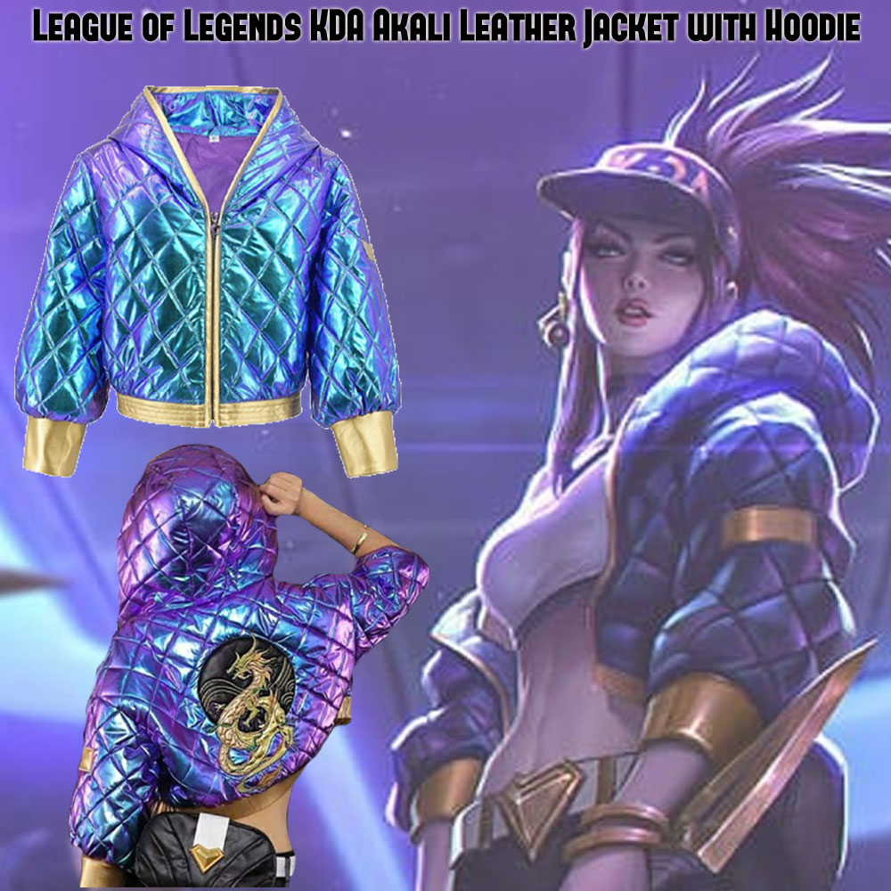 kDa Akali jacket is formed from the high and enduring quality of faux leather material. This jacket has a material quality that remains long. This jacket will shield you against cold weather and will make you feel warm and cosy. This jacket is very comfortable that you can wear it all day long because it contains inner soft viscose lining.league of legends Akali jacket has front ykk branded zipper style closure that fits in perfectly with the style of this jacket. This jacket has short length sleeves with golden cuffs. The padded design of this jacket is giving it an attractive look. This jacket has an attached hoodie. This jacket has a golden waistline as well.You can get this jacket in purple color. You will embrace the detailing of this leather jacket. Follow the details and order this jacket. We guarantee you that you will not disapprove once after buying this jacket.