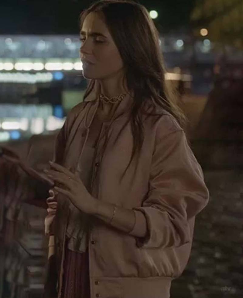 Lily Collins Paris Emily Cooper Pink Satin Bomber Jacket